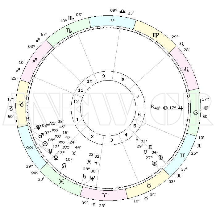 | | ΘΕΣΕΙΣ ΠΛΑΝΗΤΩΝ ΑΣΤΡΟΛΟΓΙΚΟΥ ΧΑΡΤΗ ΤΗΣ ΣΤΙΓΜΗΣ ΑΥΤΗΣ | | | | Πλανήτης | Ζώδιο | Μοίρες | Δεκαήμ. | Σε οίκο | Απόκλιση | | Ακμές των οίκων | | Ηλιος | Υδροχόος | 08°11' | Πρώτο | 2 | 18 S 13 | | 1ος | 26°02' | Τοξότης | | Σελήνη | Δίδυμοι | 03°37' | Πρώτο | 5 | 25 N 57 | | 2ος | 02°12' | Υδροχόος | | Ερμής | Υδροχόος | 12°41' | Δεύτερο | 2 | 18 S 58 | | 3ος | 11°51' | Ιχθείς | | Αφροδίτη | Υδροχόος | 13°19' | Δεύτερο | 2 | 18 S 04 | | 4ος | 16°24' | Κριός | | Αρης | Υδροχόος | 03°42' | Πρώτο | 2 | 20 S 19 | | 5ος | 13°21' | Ταύρος | | Δίας | Καρκίνος | 17°48'R | Δεύτερο | 7 | 22 N 33 | | 6ος | 05°26' | Δίδυμοι | | Κρόνος | Ιχθείς | 28°23' | Τρίτο | 3 | 02 S 39 | | 7ος | 26°02' | Δίδυμοι | | Ουρανός | Ταύρος | 27°29'R | Τρίτο | 5 | 19 N 24 | | 8ος | 02°12' | Λέων | | Ποσειδώνας | Κριός | 00°02' | Πρώτο | 3 | 01 S 12 | | 9ος | 11°51' | Παρθένος | | Πλούτωνας | Υδροχόος | 03°35' | Πρώτο | 2 | 23 S 03 | | 10ος | 16°24' | Ζυγός | | Β. Δεσμός | Ιχθείς | 10°44' | Δεύτερο | 2 | 07 S 32 | | 11ος | 13°21' | Σκορπιός | | Ωροσκόπος | Τοξότης | 26°02' | Τρίτο | | | 12ος | 05°26' | Τοξότης | | Μεσουράνημα | Ζυγός | 16°24' | Δεύτερο | | | |
