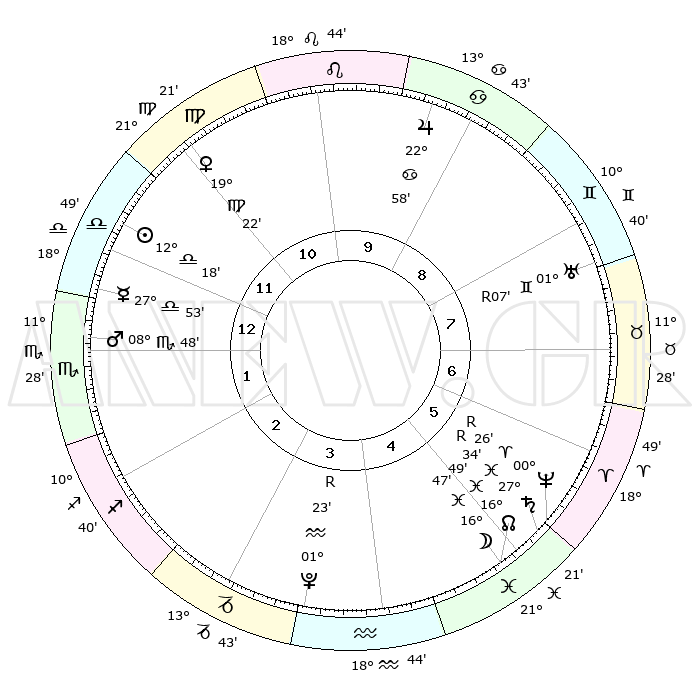 | ΘΕΣΕΙΣ ΠΛΑΝΗΤΩΝ ΑΣΤΡΟΛΟΓΙΚΟΥ ΧΑΡΤΗ ΤΗΣ ΣΤΙΓΜΗΣ ΑΥΤΗΣ | | Πλανήτης | Ζώδιο | Μοίρες | Δεκαήμ. | Σε οίκο | Απόκλιση | | Ακμές των οίκων | Ηλιος | Ζυγός | 12°12' | Δεύτερο | 1 | 04 S 49 | | 1ος | 11°05' | Ζυγός | Σελήνη | Ιχθείς | 15°18' | Δεύτερο | 5 | 06 S 02 | | 2ος | 08°24' | Σκορπιός | Ερμής | Ζυγός | 27°43' | Τρίτο | 1 | 11 S 13 | | 3ος | 09°16' | Τοξότης | Αφροδίτη | Παρθένος | 19°14' | Δεύτερο | 12 | 05 N 32 | | 4ος | 12°29' | Αιγόκερως | Αρης | Σκορπιός | 08°44' | Πρώτο | 2 | 14 S 31 | | 5ος | 15°25' | Υδροχόος | Δίας | Καρκίνος | 22°57' | Τρίτο | 10 | 21 N 30 | | 6ος | 15°22' | Ιχθείς | Κρόνος | Ιχθείς | 27°35'R | Τρίτο | 6 | 03 S 16 | | 7ος | 11°05' | Κριός | Ουρανός | Δίδυμοι | 01°07'R | Πρώτο | 8 | 20 N 10 | | 8ος | 08°24' | Ταύρος | Ποσειδώνας | Κριός | 00°26'R | Πρώτο | 6 | 01 S 05 | | 9ος | 09°16' | Δίδυμοι | Πλούτωνας | Υδροχόος | 01°23'R | Πρώτο | 4 | 23 S 32 | | 10ος | 12°29' | Καρκίνος | Β. Δεσμός | Ιχθείς | 16°49' | Δεύτερο | 6 | 05 S 12 | | 11ος | 15°25' | Λέων | Ωροσκόπος | Ζυγός | 11°05' | Δεύτερο | | | 12ος | 15°22' | Παρθένος | Μεσουράνημα | Καρκίνος | 12°29' | Δεύτερο | | | |