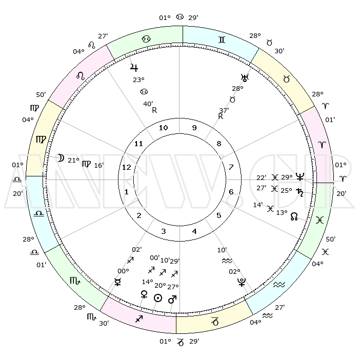 | | ΘΕΣΕΙΣ ΠΛΑΝΗΤΩΝ ΑΣΤΡΟΛΟΓΙΚΟΥ ΧΑΡΤΗ ΤΗΣ ΣΤΙΓΜΗΣ ΑΥΤΗΣ | | | | Πλανήτης | Ζώδιο | Μοίρες | Δεκαήμ. | Σε οίκο | Απόκλιση | | Ακμές των οίκων | | Ηλιος | Τοξότης | 20°09' | Τρίτο | 3 | 23 S 04 | | 1ος | 27°26' | Παρθένος | | Σελήνη | Παρθένος | 21°06' | Τρίτο | 12 | 02 N 53 | | 2ος | 23°50' | Ζυγός | | Ερμής | Τοξότης | 00°01' | Πρώτο | 3 | 18 S 17 | | 3ος | 24°10' | Σκορπιός | | Αφροδίτη | Τοξότης | 13°59' | Δεύτερο | 3 | 22 S 11 | | 4ος | 27°07' | Τοξότης | | Αρης | Τοξότης | 27°29' | Τρίτο | 4 | 24 S 10 | | 5ος | 00°08' | Υδροχόος | | Δίας | Καρκίνος | 23°40'R | Τρίτο | 10 | 21 N 33 | | 6ος | 00°40' | Ιχθείς | | Κρόνος | Ιχθείς | 25°27' | Τρίτο | 6 | 03 S 57 | | 7ος | 27°26' | Ιχθείς | | Ουρανός | Ταύρος | 28°37'R | Τρίτο | 9 | 19 N 39 | | 8ος | 23°50' | Κριός | | Ποσειδώνας | Ιχθείς | 29°22' | Τρίτο | 7 | 01 S 29 | | 9ος | 24°10' | Ταύρος | | Πλούτωνας | Υδροχόος | 02°10' | Πρώτο | 5 | 23 S 20 | | 10ος | 27°07' | Δίδυμοι | | Β. Δεσμός | Ιχθείς | 13°14' | Δεύτερο | 6 | 06 S 35 | | 11ος | 00°08' | Λέων | | Ωροσκόπος | Παρθένος | 27°26' | Τρίτο | | | 12ος | 00°40' | Παρθένος | | Μεσουράνημα | Δίδυμοι | 27°07' | Τρίτο | | | |