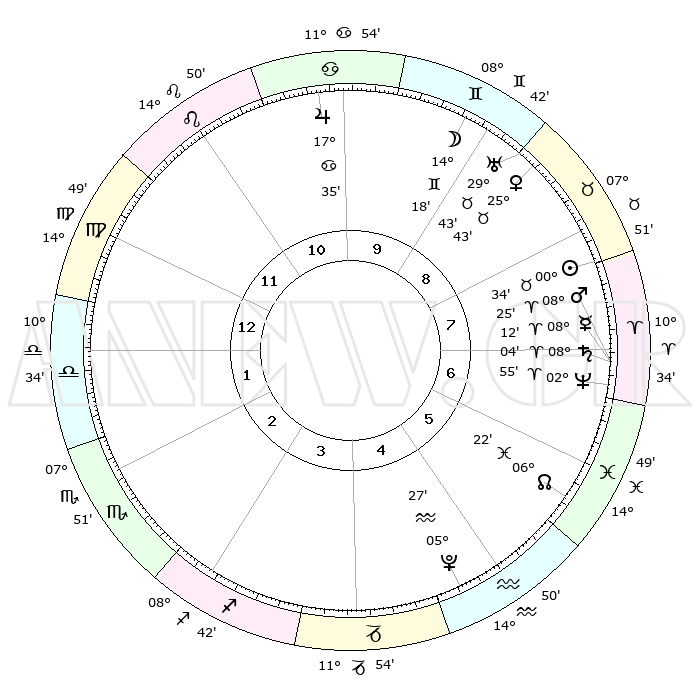 | | ΘΕΣΕΙΣ ΠΛΑΝΗΤΩΝ ΑΣΤΡΟΛΟΓΙΚΟΥ ΧΑΡΤΗ ΤΗΣ ΣΤΙΓΜΗΣ ΑΥΤΗΣ | | | | Πλανήτης | Ζώδιο | Μοίρες | Δεκαήμ. | Σε οίκο | Απόκλιση | | Ακμές των οίκων | | Ηλιος | Ταύρος | 00°31' | Πρώτο | 8 | 11 N 39 | | 1ος | 25°13' | Παρθένος | | Σελήνη | Δίδυμοι | 13°31' | Δεύτερο | 9 | 27 N 27 | | 2ος | 21°26' | Ζυγός | | Ερμής | Κριός | 08°07' | Πρώτο | 7 | 00 N 49 | | 3ος | 21°41' | Σκορπιός | | Αφροδίτη | Ταύρος | 25°39' | Τρίτο | 9 | 19 N 35 | | 4ος | 24°37' | Τοξότης | | Αρης | Κριός | 08°22' | Πρώτο | 7 | 02 N 27 | | 5ος | 27°40' | Αιγόκερως | | Δίας | Καρκίνος | 17°35' | Δεύτερο | 10 | 22 N 39 | | 6ος | 28°17' | Υδροχόος | | Κρόνος | Κριός | 08°03' | Πρώτο | 7 | 01 N 13 | | 7ος | 25°13' | Ιχθείς | | Ουρανός | Ταύρος | 29°43' | Τρίτο | 9 | 19 N 55 | | 8ος | 21°26' | Κριός | | Ποσειδώνας | Κριός | 02°55' | Πρώτο | 7 | 00 S 03 | | 9ος | 21°41' | Ταύρος | | Πλούτωνας | Υδροχόος | 05°27' | Πρώτο | 5 | 22 S 48 | | 10ος | 24°37' | Δίδυμοι | | Β. Δεσμός | Ιχθείς | 06°22' | Πρώτο | 6 | 09 S 10 | | 11ος | 27°40' | Καρκίνος | | Ωροσκόπος | Παρθένος | 25°13' | Τρίτο | | | 12ος | 28°17' | Λέων | | Μεσουράνημα | Δίδυμοι | 24°37' | Τρίτο | | | |