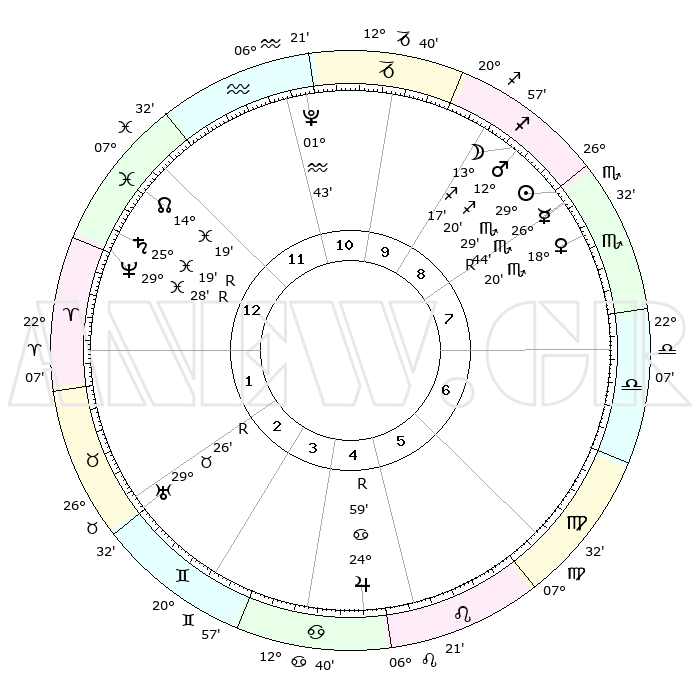 | | ΘΕΣΕΙΣ ΠΛΑΝΗΤΩΝ ΑΣΤΡΟΛΟΓΙΚΟΥ ΧΑΡΤΗ ΤΗΣ ΣΤΙΓΜΗΣ ΑΥΤΗΣ | | | | Πλανήτης | Ζώδιο | Μοίρες | Δεκαήμ. | Σε οίκο | Απόκλιση | | Ακμές των οίκων | | Ηλιος | Σκορπιός | 29°27' | Τρίτο | 8 | 20 S 02 | | 1ος | 01°11' | Κριός | | Σελήνη | Τοξότης | 12°51' | Δεύτερο | 9 | 27 S 17 | | 2ος | 11°11' | Ταύρος | | Ερμής | Σκορπιός | 26°47'R | Τρίτο | 8 | 18 S 33 | | 3ος | 08°24' | Δίδυμοι | | Αφροδίτη | Σκορπιός | 18°18' | Δεύτερο | 8 | 16 S 17 | | 4ος | 00°40' | Καρκίνος | | Αρης | Τοξότης | 12°19' | Δεύτερο | 9 | 22 S 50 | | 5ος | 23°01' | Καρκίνος | | Δίας | Καρκίνος | 24°59'R | Τρίτο | 5 | 21 N 16 | | 6ος | 20°36' | Λέων | | Κρόνος | Ιχθείς | 25°19'R | Τρίτο | 12 | 04 S 04 | | 7ος | 01°11' | Ζυγός | | Ουρανός | Ταύρος | 29°26'R | Τρίτο | 2 | 19 N 49 | | 8ος | 11°11' | Σκορπιός | | Ποσειδώνας | Ιχθείς | 29°28'R | Τρίτο | 12 | 01 S 27 | | 9ος | 08°24' | Τοξότης | | Πλούτωνας | Υδροχόος | 01°43' | Πρώτο | 11 | 23 S 27 | | 10ος | 00°40' | Αιγόκερως | | Β. Δεσμός | Ιχθείς | 14°19' | Δεύτερο | 12 | 06 S 10 | | 11ος | 23°01' | Αιγόκερως | | Ωροσκόπος | Κριός | 01°11' | Πρώτο | | | 12ος | 20°36' | Υδροχόος | | Μεσουράνημα | Αιγόκερως | 00°40' | Πρώτο | | | |