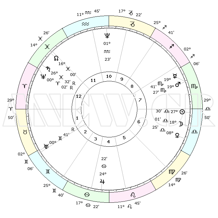 | ΘΕΣΕΙΣ ΠΛΑΝΗΤΩΝ ΑΣΤΡΟΛΟΓΙΚΟΥ ΧΑΡΤΗ ΤΗΣ ΣΤΙΓΜΗΣ ΑΥΤΗΣ | | Πλανήτης | Ζώδιο | Μοίρες | Δεκαήμ. | Σε οίκο | Απόκλιση | | Ακμές των οίκων | Ηλιος | Ζυγός | 27°23' | Τρίτο | 8 | 10 S 32 | | 1ος | 21°28' | Υδροχόος | Σελήνη | Ζυγός | 16°34' | Δεύτερο | 8 | 08 S 48 | | 2ος | 07°16' | Κριός | Ερμής | Σκορπιός | 19°31' | Δεύτερο | 9 | 19 S 48 | | 3ος | 11°42' | Ταύρος | Αφροδίτη | Ζυγός | 08°16' | Πρώτο | 8 | 01 S 52 | | 4ος | 07°01' | Δίδυμοι | Αρης | Σκορπιός | 19°22' | Δεύτερο | 9 | 17 S 50 | | 5ος | 28°49' | Δίδυμοι | Δίας | Καρκίνος | 24°22' | Τρίτο | 6 | 21 N 18 | | 6ος | 21°34' | Καρκίνος | Κρόνος | Ιχθείς | 26°32'R | Τρίτο | 1 | 03 S 40 | | 7ος | 21°28' | Λέων | Ουρανός | Δίδυμοι | 00°41'R | Πρώτο | 3 | 20 N 05 | | 8ος | 07°16' | Ζυγός | Ποσειδώνας | Κριός | 00°02'R | Πρώτο | 1 | 01 S 15 | | 9ος | 11°42' | Σκορπιός | Πλούτωνας | Υδροχόος | 01°23' | Πρώτο | 12 | 23 S 32 | | 10ος | 07°01' | Τοξότης | Β. Δεσμός | Ιχθείς | 16°00' | Δεύτερο | 1 | 05 S 31 | | 11ος | 28°49' | Τοξότης | Ωροσκόπος | Υδροχόος | 21°28' | Τρίτο | | | 12ος | 21°34' | Αιγόκερως | Μεσουράνημα | Τοξότης | 07°01' | Πρώτο | | | |