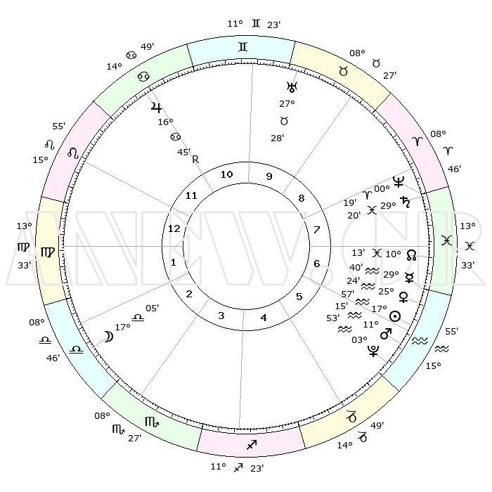| | ΘΕΣΕΙΣ ΠΛΑΝΗΤΩΝ ΑΣΤΡΟΛΟΓΙΚΟΥ ΧΑΡΤΗ ΤΗΣ ΣΤΙΓΜΗΣ ΑΥΤΗΣ | | | | Πλανήτης | Ζώδιο | Μοίρες | Δεκαήμ. | Σε οίκο | Απόκλιση | | Ακμές των οίκων | | Ηλιος | Υδροχόος | 17°53' | Δεύτερο | 6 | 15 S 28 | | 1ος | 23°54' | Λέων | | Σελήνη | Ζυγός | 16°14' | Δεύτερο | 3 | 09 S 19 | | 2ος | 17°07' | Παρθένος | | Ερμής | Υδροχόος | 29°32' | Τρίτο | 7 | 12 S 55 | | 3ος | 15°11' | Ζυγός | | Αφροδίτη | Υδροχόος | 25°19' | Τρίτο | 7 | 14 S 26 | | 4ος | 17°59' | Σκορπιός | | Αρης | Υδροχόος | 11°11' | Δεύτερο | 6 | 18 S 26 | | 5ος | 22°37' | Τοξότης | | Δίας | Καρκίνος | 16°45'R | Δεύτερο | 11 | 22 N 42 | | 6ος | 25°06' | Αιγόκερως | | Κρόνος | Ιχθείς | 29°20' | Τρίτο | 8 | 02 S 15 | | 7ος | 23°54' | Υδροχόος | | Ουρανός | Ταύρος | 27°28' | Τρίτο | 10 | 19 N 24 | | 8ος | 17°07' | Ιχθείς | | Ποσειδώνας | Κριός | 00°18' | Πρώτο | 8 | 01 S 05 | | 9ος | 15°11' | Κριός | | Πλούτωνας | Υδροχόος | 03°53' | Πρώτο | 6 | 22 S 59 | | 10ος | 17°59' | Ταύρος | | Β. Δεσμός | Ιχθείς | 10°14' | Δεύτερο | 7 | 07 S 44 | | 11ος | 22°37' | Δίδυμοι | | Ωροσκόπος | Λέων | 23°54' | Τρίτο | | | 12ος | 25°06' | Καρκίνος | | Μεσουράνημα | Ταύρος | 17°59' | Δεύτερο | | | |
