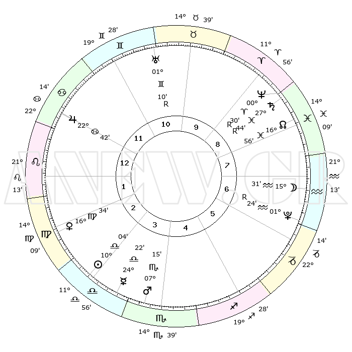 | ΘΕΣΕΙΣ ΠΛΑΝΗΤΩΝ ΑΣΤΡΟΛΟΓΙΚΟΥ ΧΑΡΤΗ ΤΗΣ ΣΤΙΓΜΗΣ ΑΥΤΗΣ | | Πλανήτης | Ζώδιο | Μοίρες | Δεκαήμ. | Σε οίκο | Απόκλιση | | Ακμές των οίκων | Ηλιος | Ζυγός | 10°00' | Δεύτερο | 3 | 03 S 58 | | 1ος | 04°19' | Λέων | Σελήνη | Υδροχόος | 14°45' | Δεύτερο | 7 | 19 S 11 | | 2ος | 25°40' | Λέων | Ερμής | Ζυγός | 24°17' | Τρίτο | 4 | 09 S 44 | | 3ος | 21°18' | Παρθένος | Αφροδίτη | Παρθένος | 16°30' | Δεύτερο | 2 | 06 N 33 | | 4ος | 22°50' | Ζυγός | Αρης | Σκορπιός | 07°13' | Πρώτο | 4 | 14 S 01 | | 5ος | 28°44' | Σκορπιός | Δίας | Καρκίνος | 22°42' | Τρίτο | 12 | 21 N 33 | | 6ος | 03°45' | Αιγόκερως | Κρόνος | Ιχθείς | 27°44'R | Τρίτο | 9 | 03 S 12 | | 7ος | 04°19' | Υδροχόος | Ουρανός | Δίδυμοι | 01°10'R | Πρώτο | 11 | 20 N 11 | | 8ος | 25°40' | Υδροχόος | Ποσειδώνας | Κριός | 00°30'R | Πρώτο | 9 | 01 S 04 | | 9ος | 21°18' | Ιχθείς | Πλούτωνας | Υδροχόος | 01°24'R | Πρώτο | 6 | 23 S 32 | | 10ος | 22°50' | Κριός | Β. Δεσμός | Ιχθείς | 16°56' | Δεύτερο | 8 | 05 S 09 | | 11ος | 28°44' | Ταύρος | Ωροσκόπος | Λέων | 04°19' | Πρώτο | | | 12ος | 03°45' | Καρκίνος | Μεσουράνημα | Κριός | 22°50' | Τρίτο | | | |