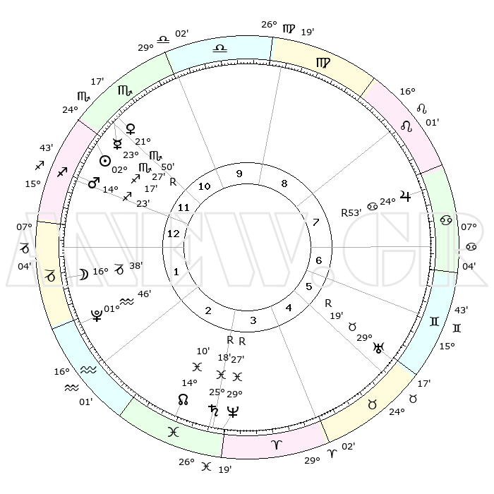 | | ΘΕΣΕΙΣ ΠΛΑΝΗΤΩΝ ΑΣΤΡΟΛΟΓΙΚΟΥ ΧΑΡΤΗ ΤΗΣ ΣΤΙΓΜΗΣ ΑΥΤΗΣ | | | | Πλανήτης | Ζώδιο | Μοίρες | Δεκαήμ. | Σε οίκο | Απόκλιση | | Ακμές των οίκων | | Ηλιος | Τοξότης | 02°14' | Πρώτο | 12 | 20 S 36 | | 1ος | 18°40' | Τοξότης | | Σελήνη | Αιγόκερως | 15°57' | Δεύτερο | 1 | 26 S 44 | | 2ος | 23°07' | Αιγόκερως | | Ερμής | Σκορπιός | 23°30'R | Τρίτο | 11 | 16 S 59 | | 3ος | 01°52' | Ιχθείς | | Αφροδίτη | Σκορπιός | 21°46' | Τρίτο | 11 | 17 S 18 | | 4ος | 07°17' | Κριός | | Αρης | Τοξότης | 14°20' | Δεύτερο | 12 | 23 S 07 | | 5ος | 05°29' | Ταύρος | | Δίας | Καρκίνος | 24°53'R | Τρίτο | 8 | 21 N 17 | | 6ος | 28°14' | Ταύρος | | Κρόνος | Ιχθείς | 25°18'R | Τρίτο | 3 | 04 S 04 | | 7ος | 18°40' | Δίδυμοι | | Ουρανός | Ταύρος | 29°19'R | Τρίτο | 6 | 19 N 48 | | 8ος | 23°07' | Καρκίνος | | Ποσειδώνας | Ιχθείς | 29°27'R | Τρίτο | 3 | 01 S 28 | | 9ος | 01°52' | Παρθένος | | Πλούτωνας | Υδροχόος | 01°46' | Πρώτο | 2 | 23 S 26 | | 10ος | 07°17' | Ζυγός | | Β. Δεσμός | Ιχθείς | 14°10' | Δεύτερο | 3 | 06 S 14 | | 11ος | 05°29' | Σκορπιός | | Ωροσκόπος | Τοξότης | 18°40' | Δεύτερο | | | 12ος | 28°14' | Σκορπιός | | Μεσουράνημα | Ζυγός | 07°17' | Πρώτο | | | |