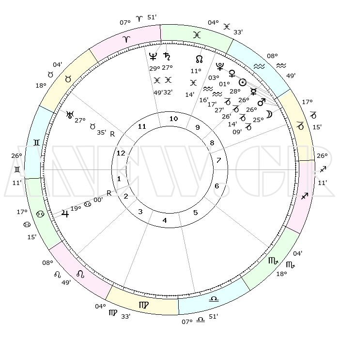 | | ΘΕΣΕΙΣ ΠΛΑΝΗΤΩΝ ΑΣΤΡΟΛΟΓΙΚΟΥ ΧΑΡΤΗ ΤΗΣ ΣΤΙΓΜΗΣ ΑΥΤΗΣ | | | | Πλανήτης | Ζώδιο | Μοίρες | Δεκαήμ. | Σε οίκο | Απόκλιση | | Ακμές των οίκων | | Ηλιος | Αιγόκερως | 28°23' | Τρίτο | 9 | 20 S 29 | | 1ος | 03°41' | Δίδυμοι | | Σελήνη | Αιγόκερως | 24°24' | Τρίτο | 9 | 24 S 50 | | 2ος | 27°47' | Δίδυμοι | | Ερμής | Αιγόκερως | 26°20' | Τρίτο | 9 | 22 S 48 | | 3ος | 19°05' | Καρκίνος | | Αφροδίτη | Υδροχόος | 01°12' | Πρώτο | 9 | 20 S 56 | | 4ος | 12°08' | Λέων | | Αρης | Αιγόκερως | 26°11' | Τρίτο | 9 | 21 S 53 | | 5ος | 11°15' | Παρθένος | | Δίας | Καρκίνος | 19°01'R | Δεύτερο | 2 | 22 N 22 | | 6ος | 20°15' | Ζυγός | | Κρόνος | Ιχθείς | 27°32' | Τρίτο | 11 | 03 S 01 | | 7ος | 03°41' | Τοξότης | | Ουρανός | Ταύρος | 27°35'R | Τρίτο | 12 | 19 N 26 | | 8ος | 27°47' | Τοξότης | | Ποσειδώνας | Ιχθείς | 29°48' | Τρίτο | 11 | 01 S 17 | | 9ος | 19°05' | Αιγόκερως | | Πλούτωνας | Υδροχόος | 03°16' | Πρώτο | 9 | 23 S 06 | | 10ος | 12°08' | Υδροχόος | | Β. Δεσμός | Ιχθείς | 11°15' | Δεύτερο | 10 | 07 S 21 | | 11ος | 11°15' | Ιχθείς | | Ωροσκόπος | Δίδυμοι | 03°41' | Πρώτο | | | 12ος | 20°15' | Κριός | | Μεσουράνημα | Υδροχόος | 12°08' | Δεύτερο | | | |