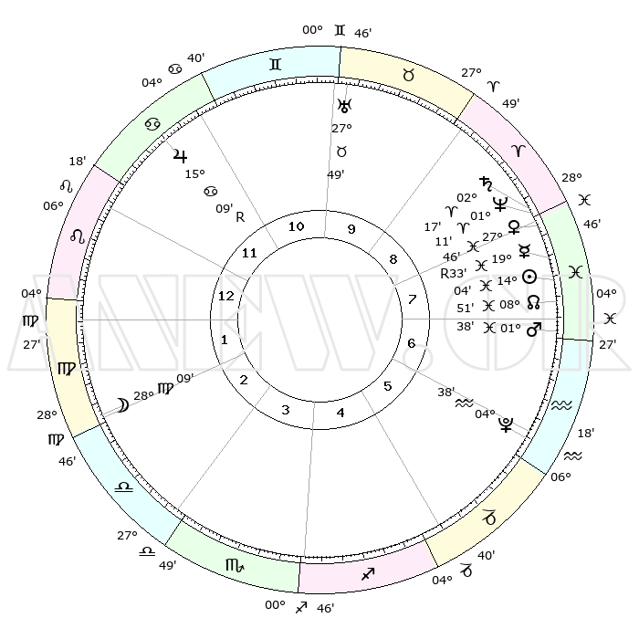 | | ΘΕΣΕΙΣ ΠΛΑΝΗΤΩΝ ΑΣΤΡΟΛΟΓΙΚΟΥ ΧΑΡΤΗ ΤΗΣ ΣΤΙΓΜΗΣ ΑΥΤΗΣ | | | | Πλανήτης | Ζώδιο | Μοίρες | Δεκαήμ. | Σε οίκο | Απόκλιση | | Ακμές των οίκων | | Ηλιος | Ιχθείς | 14°00' | Δεύτερο | 8 | 06 S 18 | | 1ος | 15°30' | Λέων | | Σελήνη | Παρθένος | 27°18' | Τρίτο | 2 | 00 S 27 | | 2ος | 07°51' | Παρθένος | | Ερμής | Ιχθείς | 19°36'R | Δεύτερο | 8 | 00 S 45 | | 3ος | 04°57' | Ζυγός | | Αφροδίτη | Ιχθείς | 27°41' | Τρίτο | 8 | 02 S 07 | | 4ος | 07°24' | Σκορπιός | | Αρης | Ιχθείς | 01°34' | Πρώτο | 7 | 11 S 56 | | 5ος | 12°39' | Τοξότης | | Δίας | Καρκίνος | 15°09'R | Δεύτερο | 11 | 22 N 55 | | 6ος | 16°04' | Αιγόκερως | | Κρόνος | Κριός | 02°16' | Πρώτο | 8 | 01 S 03 | | 7ος | 15°30' | Υδροχόος | | Ουρανός | Ταύρος | 27°49' | Τρίτο | 10 | 19 N 30 | | 8ος | 07°51' | Ιχθείς | | Ποσειδώνας | Κριός | 01°11' | Πρώτο | 8 | 00 S 44 | | 9ος | 04°57' | Κριός | | Πλούτωνας | Υδροχόος | 04°38' | Πρώτο | 6 | 22 S 52 | | 10ος | 07°24' | Ταύρος | | Β. Δεσμός | Ιχθείς | 08°51' | Πρώτο | 8 | 08 S 15 | | 11ος | 12°39' | Δίδυμοι | | Ωροσκόπος | Λέων | 15°30' | Δεύτερο | | | 12ος | 16°04' | Καρκίνος | | Μεσουράνημα | Ταύρος | 07°24' | Πρώτο | | | |