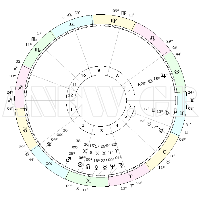 | | ΘΕΣΕΙΣ ΠΛΑΝΗΤΩΝ ΑΣΤΡΟΛΟΓΙΚΟΥ ΧΑΡΤΗ ΤΗΣ ΣΤΙΓΜΗΣ ΑΥΤΗΣ | | | | Πλανήτης | Ζώδιο | Μοίρες | Δεκαήμ. | Σε οίκο | Απόκλιση | | Ακμές των οίκων | | Ηλιος | Ιχθείς | 06°22' | Πρώτο | 3 | 09 S 10 | | 1ος | 05°10' | Τοξότης | | Σελήνη | Δίδυμοι | 12°25' | Δεύτερο | 7 | 27 N 30 | | 2ος | 07°04' | Αιγόκερως | | Ερμής | Ιχθείς | 22°25' | Τρίτο | 4 | 00 S 43 | | 3ος | 13°38' | Υδροχόος | | Αφροδίτη | Ιχθείς | 18°12' | Δεύτερο | 3 | 05 S 58 | | 4ος | 19°44' | Ιχθείς | | Αρης | Υδροχόος | 25°35' | Τρίτο | 3 | 14 S 01 | | 5ος | 20°04' | Κριός | | Δίας | Καρκίνος | 15°25'R | Δεύτερο | 8 | 22 N 53 | | 6ος | 14°26' | Ταύρος | | Κρόνος | Κριός | 01°22' | Πρώτο | 4 | 01 S 25 | | 7ος | 05°10' | Δίδυμοι | | Ουρανός | Ταύρος | 27°39' | Τρίτο | 6 | 19 N 27 | | 8ος | 07°04' | Καρκίνος | | Ποσειδώνας | Κριός | 00°54' | Πρώτο | 4 | 00 S 50 | | 9ος | 13°38' | Λέων | | Πλούτωνας | Υδροχόος | 04°26' | Πρώτο | 2 | 22 S 54 | | 10ος | 19°44' | Παρθένος | | Β. Δεσμός | Ιχθείς | 09°15' | Πρώτο | 3 | 08 S 06 | | 11ος | 20°04' | Ζυγός | | Ωροσκόπος | Τοξότης | 05°10' | Πρώτο | | | 12ος | 14°26' | Σκορπιός | | Μεσουράνημα | Παρθένος | 19°44' | Δεύτερο | | | |