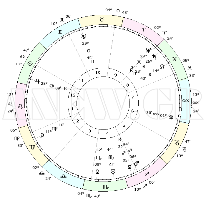 | | ΘΕΣΕΙΣ ΠΛΑΝΗΤΩΝ ΑΣΤΡΟΛΟΓΙΚΟΥ ΧΑΡΤΗ ΤΗΣ ΣΤΙΓΜΗΣ ΑΥΤΗΣ | | | | Πλανήτης | Ζώδιο | Μοίρες | Δεκαήμ. | Σε οίκο | Απόκλιση | | Ακμές των οίκων | | Ηλιος | Σκορπιός | 21°41' | Τρίτο | 5 | 18 S 11 | | 1ος | 24°59' | Καρκίνος | | Σελήνη | Παρθένος | 10°23' | Δεύτερο | 3 | 08 N 09 | | 2ος | 15°44' | Λέων | | Ερμής | Τοξότης | 05°35'R | Πρώτο | 5 | 22 S 45 | | 3ος | 10°07' | Παρθένος | | Αφροδίτη | Σκορπιός | 08°37' | Πρώτο | 4 | 13 S 12 | | 4ος | 10°28' | Ζυγός | | Αρης | Τοξότης | 06°42' | Πρώτο | 5 | 21 S 56 | | 5ος | 16°34' | Σκορπιός | | Δίας | Καρκίνος | 25°09'R | Τρίτο | 1 | 21 N 13 | | 6ος | 23°07' | Τοξότης | | Κρόνος | Ιχθείς | 25°28'R | Τρίτο | 9 | 04 S 02 | | 7ος | 24°59' | Αιγόκερως | | Ουρανός | Ταύρος | 29°46'R | Τρίτο | 11 | 19 N 53 | | 8ος | 15°44' | Υδροχόος | | Ποσειδώνας | Ιχθείς | 29°34'R | Τρίτο | 9 | 01 S 25 | | 9ος | 10°07' | Ιχθείς | | Πλούτωνας | Υδροχόος | 01°36' | Πρώτο | 7 | 23 S 28 | | 10ος | 10°28' | Κριός | | Β. Δεσμός | Ιχθείς | 14°43' | Δεύτερο | 9 | 06 S 01 | | 11ος | 16°34' | Ταύρος | | Ωροσκόπος | Καρκίνος | 24°59' | Τρίτο | | | 12ος | 23°07' | Δίδυμοι | | Μεσουράνημα | Κριός | 10°28' | Δεύτερο | | | |