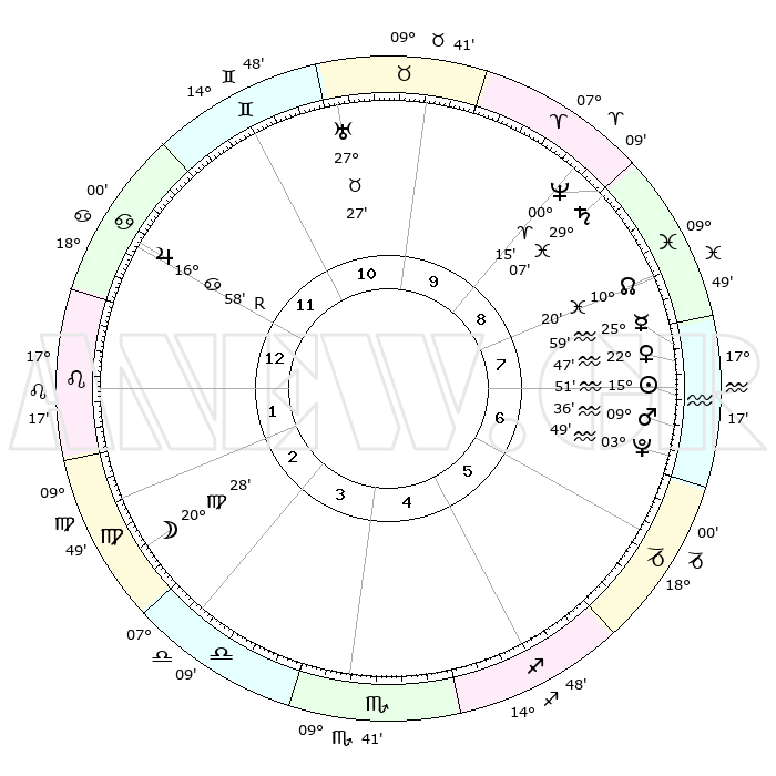 | | ΘΕΣΕΙΣ ΠΛΑΝΗΤΩΝ ΑΣΤΡΟΛΟΓΙΚΟΥ ΧΑΡΤΗ ΤΗΣ ΣΤΙΓΜΗΣ ΑΥΤΗΣ | | | | Πλανήτης | Ζώδιο | Μοίρες | Δεκαήμ. | Σε οίκο | Απόκλιση | | Ακμές των οίκων | | Ηλιος | Υδροχόος | 15°46' | Δεύτερο | 8 | 16 S 06 | | 1ος | 24°02' | Καρκίνος | | Σελήνη | Παρθένος | 19°25' | Δεύτερο | 3 | 03 N 19 | | 2ος | 14°44' | Λέων | | Ερμής | Υδροχόος | 25°50' | Τρίτο | 8 | 14 S 25 | | 3ος | 08°59' | Παρθένος | | Αφροδίτη | Υδροχόος | 22°41' | Τρίτο | 8 | 15 S 17 | | 4ος | 09°12' | Ζυγός | | Αρης | Υδροχόος | 09°33' | Πρώτο | 7 | 18 S 52 | | 5ος | 15°18' | Σκορπιός | | Δίας | Καρκίνος | 16°58'R | Δεύτερο | 12 | 22 N 40 | | 6ος | 22°00' | Τοξότης | | Κρόνος | Ιχθείς | 29°07' | Τρίτο | 9 | 02 S 20 | | 7ος | 24°02' | Αιγόκερως | | Ουρανός | Ταύρος | 27°27' | Τρίτο | 11 | 19 N 24 | | 8ος | 14°44' | Υδροχόος | | Ποσειδώνας | Κριός | 00°15' | Πρώτο | 9 | 01 S 06 | | 9ος | 08°59' | Ιχθείς | | Πλούτωνας | Υδροχόος | 03°49' | Πρώτο | 7 | 23 S 00 | | 10ος | 09°12' | Κριός | | Β. Δεσμός | Ιχθείς | 10°20' | Δεύτερο | 9 | 07 S 41 | | 11ος | 15°18' | Ταύρος | | Ωροσκόπος | Καρκίνος | 24°02' | Τρίτο | | | 12ος | 22°00' | Δίδυμοι | | Μεσουράνημα | Κριός | 09°12' | Πρώτο | | | |