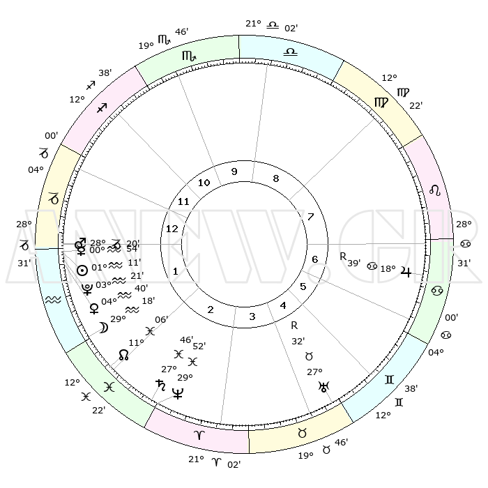 | | ΘΕΣΕΙΣ ΠΛΑΝΗΤΩΝ ΑΣΤΡΟΛΟΓΙΚΟΥ ΧΑΡΤΗ ΤΗΣ ΣΤΙΓΜΗΣ ΑΥΤΗΣ | | | | Πλανήτης | Ζώδιο | Μοίρες | Δεκαήμ. | Σε οίκο | Απόκλιση | | Ακμές των οίκων | | Ηλιος | Υδροχόος | 01°06' | Πρώτο | 1 | 19 S 54 | | 1ος | 00°55' | Αιγόκερως | | Σελήνη | Υδροχόος | 28°21' | Τρίτο | 2 | 12 S 59 | | 2ος | 08°18' | Υδροχόος | | Ερμής | Υδροχόος | 00°47' | Πρώτο | 1 | 21 S 58 | | 3ος | 18°22' | Ιχθείς | | Αφροδίτη | Υδροχόος | 04°34' | Πρώτο | 1 | 20 S 14 | | 4ος | 22°10' | Κριός | | Αρης | Αιγόκερως | 28°16' | Τρίτο | 1 | 21 S 29 | | 5ος | 18°20' | Ταύρος | | Δίας | Καρκίνος | 18°40'R | Δεύτερο | 7 | 22 N 25 | | 6ος | 10°04' | Δίδυμοι | | Κρόνος | Ιχθείς | 27°45' | Τρίτο | 3 | 02 S 55 | | 7ος | 00°55' | Καρκίνος | | Ουρανός | Ταύρος | 27°32'R | Τρίτο | 5 | 19 N 25 | | 8ος | 08°18' | Λέων | | Ποσειδώνας | Ιχθείς | 29°52' | Τρίτο | 3 | 01 S 16 | | 9ος | 18°22' | Παρθένος | | Πλούτωνας | Υδροχόος | 03°21' | Πρώτο | 1 | 23 S 05 | | 10ος | 22°10' | Ζυγός | | Β. Δεσμός | Ιχθείς | 11°06' | Δεύτερο | 2 | 07 S 24 | | 11ος | 18°20' | Σκορπιός | | Ωροσκόπος | Αιγόκερως | 00°55' | Πρώτο | | | 12ος | 10°04' | Τοξότης | | Μεσουράνημα | Ζυγός | 22°10' | Τρίτο | | | |