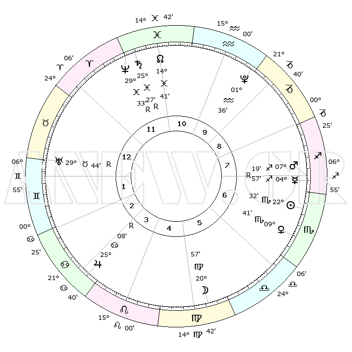 | | ΘΕΣΕΙΣ ΠΛΑΝΗΤΩΝ ΑΣΤΡΟΛΟΓΙΚΟΥ ΧΑΡΤΗ ΤΗΣ ΣΤΙΓΜΗΣ ΑΥΤΗΣ | | | | Πλανήτης | Ζώδιο | Μοίρες | Δεκαήμ. | Σε οίκο | Απόκλιση | | Ακμές των οίκων | | Ηλιος | Σκορπιός | 22°28' | Τρίτο | 7 | 18 S 23 | | 1ος | 07°15' | Ταύρος | | Σελήνη | Παρθένος | 20°09' | Τρίτο | 5 | 03 N 35 | | 2ος | 07°30' | Δίδυμοι | | Ερμής | Τοξότης | 05°00'R | Πρώτο | 7 | 22 S 26 | | 3ος | 00°22' | Καρκίνος | | Αφροδίτη | Σκορπιός | 09°36' | Πρώτο | 7 | 13 S 32 | | 4ος | 22°08' | Καρκίνος | | Αρης | Τοξότης | 07°16' | Πρώτο | 7 | 22 S 02 | | 5ος | 17°18' | Λέων | | Δίας | Καρκίνος | 25°08'R | Τρίτο | 4 | 21 N 13 | | 6ος | 21°28' | Παρθένος | | Κρόνος | Ιχθείς | 25°27'R | Τρίτο | 12 | 04 S 02 | | 7ος | 07°15' | Σκορπιός | | Ουρανός | Ταύρος | 29°44'R | Τρίτο | 1 | 19 N 53 | | 8ος | 07°30' | Τοξότης | | Ποσειδώνας | Ιχθείς | 29°33'R | Τρίτο | 12 | 01 S 26 | | 9ος | 00°22' | Αιγόκερως | | Πλούτωνας | Υδροχόος | 01°36' | Πρώτο | 10 | 23 S 28 | | 10ος | 22°08' | Αιγόκερως | | Β. Δεσμός | Ιχθείς | 14°41' | Δεύτερο | 11 | 06 S 02 | | 11ος | 17°18' | Υδροχόος | | Ωροσκόπος | Ταύρος | 07°15' | Πρώτο | | | 12ος | 21°28' | Ιχθείς | | Μεσουράνημα | Αιγόκερως | 22°08' | Τρίτο | | | |