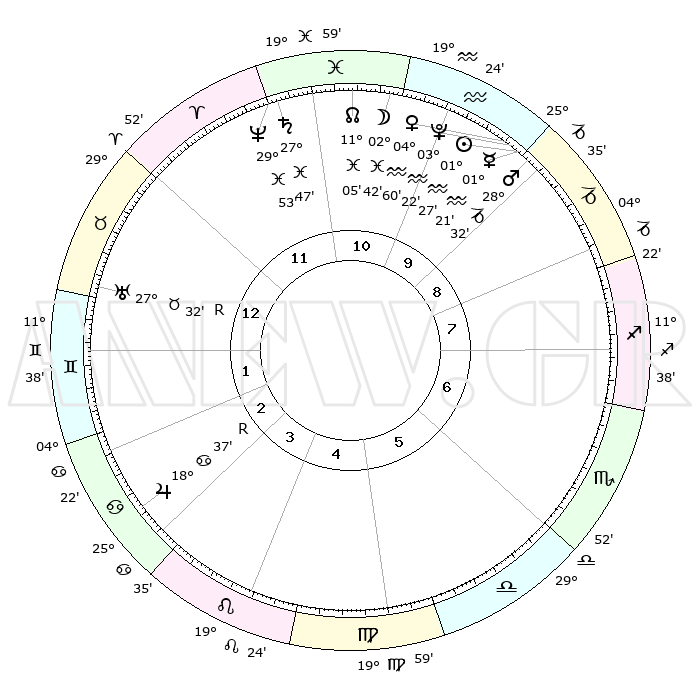 | | ΘΕΣΕΙΣ ΠΛΑΝΗΤΩΝ ΑΣΤΡΟΛΟΓΙΚΟΥ ΧΑΡΤΗ ΤΗΣ ΣΤΙΓΜΗΣ ΑΥΤΗΣ | | | | Πλανήτης | Ζώδιο | Μοίρες | Δεκαήμ. | Σε οίκο | Απόκλιση | | Ακμές των οίκων | | Ηλιος | Υδροχόος | 01°23' | Πρώτο | 10 | 19 S 51 | | 1ος | 13°39' | Ταύρος | | Σελήνη | Ιχθείς | 01°52' | Πρώτο | 11 | 11 S 26 | | 2ος | 12°14' | Δίδυμοι | | Ερμής | Υδροχόος | 01°14' | Πρώτο | 10 | 21 S 53 | | 3ος | 04°34' | Καρκίνος | | Αφροδίτη | Υδροχόος | 04°55' | Πρώτο | 10 | 20 S 09 | | 4ος | 26°29' | Καρκίνος | | Αρης | Αιγόκερως | 28°29' | Τρίτο | 10 | 21 S 26 | | 5ος | 22°27' | Λέων | | Δίας | Καρκίνος | 18°38'R | Δεύτερο | 3 | 22 N 25 | | 6ος | 27°54' | Παρθένος | | Κρόνος | Ιχθείς | 27°47' | Τρίτο | 11 | 02 S 54 | | 7ος | 13°39' | Σκορπιός | | Ουρανός | Ταύρος | 27°32'R | Τρίτο | 1 | 19 N 25 | | 8ος | 12°14' | Τοξότης | | Ποσειδώνας | Ιχθείς | 29°52' | Τρίτο | 12 | 01 S 16 | | 9ος | 04°34' | Αιγόκερως | | Πλούτωνας | Υδροχόος | 03°22' | Πρώτο | 10 | 23 S 05 | | 10ος | 26°29' | Αιγόκερως | | Β. Δεσμός | Ιχθείς | 11°05' | Δεύτερο | 11 | 07 S 24 | | 11ος | 22°27' | Υδροχόος | | Ωροσκόπος | Ταύρος | 13°39' | Δεύτερο | | | 12ος | 27°54' | Ιχθείς | | Μεσουράνημα | Αιγόκερως | 26°29' | Τρίτο | | | |