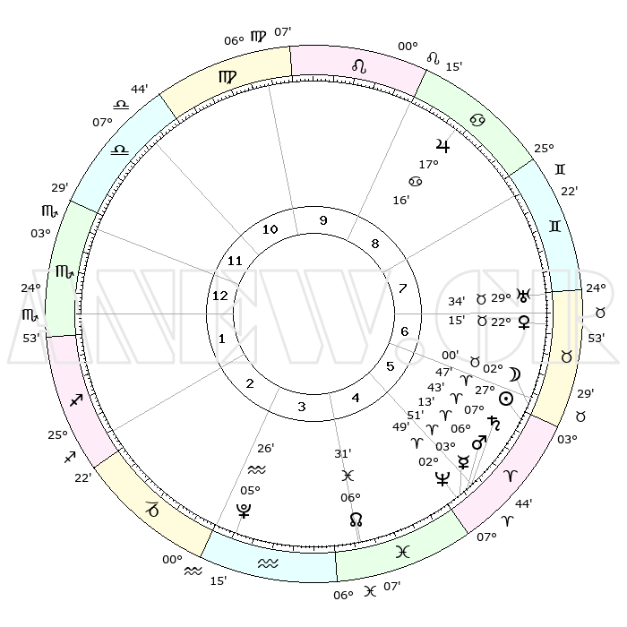 | | ΘΕΣΕΙΣ ΠΛΑΝΗΤΩΝ ΑΣΤΡΟΛΟΓΙΚΟΥ ΧΑΡΤΗ ΤΗΣ ΣΤΙΓΜΗΣ ΑΥΤΗΣ | | | | Πλανήτης | Ζώδιο | Μοίρες | Δεκαήμ. | Σε οίκο | Απόκλιση | | Ακμές των οίκων | | Ηλιος | Κριός | 27°44' | Τρίτο | 6 | 10 N 40 | | 1ος | 08°36' | Σκορπιός | | Σελήνη | Ταύρος | 01°11' | Πρώτο | 6 | 15 N 43 | | 2ος | 07°34' | Τοξότης | | Ερμής | Κριός | 03°46' | Πρώτο | 5 | 00 S 55 | | 3ος | 10°19' | Αιγόκερως | | Αφροδίτη | Ταύρος | 22°11' | Τρίτο | 7 | 18 N 36 | | 4ος | 15°07' | Υδροχόος | | Αρης | Κριός | 06°10' | Πρώτο | 5 | 01 N 34 | | 5ος | 17°51' | Ιχθείς | | Δίας | Καρκίνος | 17°15' | Δεύτερο | 9 | 22 N 42 | | 6ος | 15°39' | Κριός | | Κρόνος | Κριός | 07°43' | Πρώτο | 5 | 01 N 05 | | 7ος | 08°36' | Ταύρος | | Ουρανός | Ταύρος | 29°34' | Τρίτο | 7 | 19 N 53 | | 8ος | 07°34' | Δίδυμοι | | Ποσειδώνας | Κριός | 02°49' | Πρώτο | 5 | 00 S 05 | | 9ος | 10°19' | Καρκίνος | | Πλούτωνας | Υδροχόος | 05°26' | Πρώτο | 3 | 22 S 47 | | 10ος | 15°07' | Λέων | | Β. Δεσμός | Ιχθείς | 06°31' | Πρώτο | 4 | 09 S 07 | | 11ος | 17°51' | Παρθένος | | Ωροσκόπος | Σκορπιός | 08°36' | Πρώτο | | | 12ος | 15°39' | Ζυγός | | Μεσουράνημα | Λέων | 15°07' | Δεύτερο | | | |