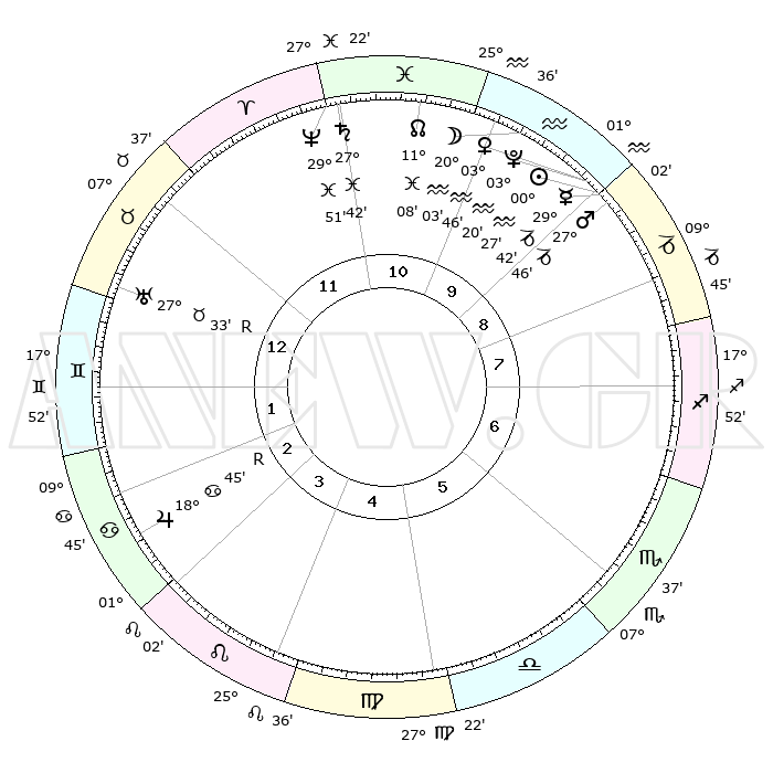 | | ΘΕΣΕΙΣ ΠΛΑΝΗΤΩΝ ΑΣΤΡΟΛΟΓΙΚΟΥ ΧΑΡΤΗ ΤΗΣ ΣΤΙΓΜΗΣ ΑΥΤΗΣ | | | | Πλανήτης | Ζώδιο | Μοίρες | Δεκαήμ. | Σε οίκο | Απόκλιση | | Ακμές των οίκων | | Ηλιος | Υδροχόος | 00°21' | Πρώτο | 10 | 20 S 04 | | 1ος | 07°46' | Ταύρος | | Σελήνη | Υδροχόος | 18°51' | Δεύτερο | 11 | 16 S 54 | | 2ος | 07°52' | Δίδυμοι | | Ερμής | Αιγόκερως | 29°33' | Τρίτο | 10 | 22 S 13 | | 3ος | 00°42' | Καρκίνος | | Αφροδίτη | Υδροχόος | 03°39' | Πρώτο | 10 | 20 S 26 | | 4ος | 22°28' | Καρκίνος | | Αρης | Αιγόκερως | 27°42' | Τρίτο | 10 | 21 S 36 | | 5ος | 17°42' | Λέων | | Δίας | Καρκίνος | 18°46'R | Δεύτερο | 3 | 22 N 24 | | 6ος | 21°58' | Παρθένος | | Κρόνος | Ιχθείς | 27°41' | Τρίτο | 12 | 02 S 56 | | 7ος | 07°46' | Σκορπιός | | Ουρανός | Ταύρος | 27°33'R | Τρίτο | 1 | 19 N 25 | | 8ος | 07°52' | Τοξότης | | Ποσειδώνας | Ιχθείς | 29°51' | Τρίτο | 12 | 01 S 16 | | 9ος | 00°42' | Αιγόκερως | | Πλούτωνας | Υδροχόος | 03°20' | Πρώτο | 10 | 23 S 06 | | 10ος | 22°28' | Αιγόκερως | | Β. Δεσμός | Ιχθείς | 11°08' | Δεύτερο | 11 | 07 S 23 | | 11ος | 17°42' | Υδροχόος | | Ωροσκόπος | Ταύρος | 07°46' | Πρώτο | | | 12ος | 21°58' | Ιχθείς | | Μεσουράνημα | Αιγόκερως | 22°28' | Τρίτο | | | |