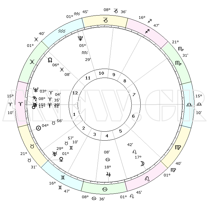 | | ΘΕΣΕΙΣ ΠΛΑΝΗΤΩΝ ΑΣΤΡΟΛΟΓΙΚΟΥ ΧΑΡΤΗ ΤΗΣ ΣΤΙΓΜΗΣ ΑΥΤΗΣ | | | | Πλανήτης | Ζώδιο | Μοίρες | Δεκαήμ. | Σε οίκο | Απόκλιση | | Ακμές των οίκων | | Ηλιος | Ταύρος | 04°52' | Πρώτο | 2 | 13 N 09 | | 1ος | 10°42' | Ιχθείς | | Σελήνη | Λέων | 16°54' | Δεύτερο | 6 | 17 N 28 | | 2ος | 24°53' | Κριός | | Ερμής | Κριός | 15°24' | Δεύτερο | 1 | 03 N 49 | | 3ος | 25°33' | Ταύρος | | Αφροδίτη | Δίδυμοι | 01°05' | Πρώτο | 3 | 21 N 00 | | 4ος | 19°00' | Δίδυμοι | | Αρης | Κριός | 11°49' | Δεύτερο | 1 | 03 N 49 | | 5ος | 10°45' | Καρκίνος | | Δίας | Καρκίνος | 18°08' | Δεύτερο | 5 | 22 N 35 | | 6ος | 05°30' | Λέων | | Κρόνος | Κριός | 08°35' | Πρώτο | 1 | 01 N 25 | | 7ος | 10°42' | Παρθένος | | Ουρανός | Ταύρος | 29°57' | Τρίτο | 3 | 19 N 58 | | 8ος | 24°53' | Ζυγός | | Ποσειδώνας | Κριός | 03°04' | Πρώτο | 1 | 00 N 01 | | 9ος | 25°33' | Σκορπιός | | Πλούτωνας | Υδροχόος | 05°29' | Πρώτο | 11 | 22 S 48 | | 10ος | 19°00' | Τοξότης | | Β. Δεσμός | Ιχθείς | 06°08' | Πρώτο | 12 | 09 S 16 | | 11ος | 10°45' | Αιγόκερως | | Ωροσκόπος | Ιχθείς | 10°42' | Δεύτερο | | | 12ος | 05°30' | Υδροχόος | | Μεσουράνημα | Τοξότης | 19°00' | Δεύτερο | | | |