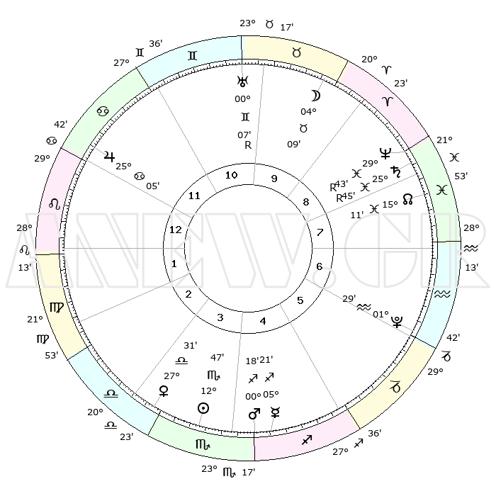 | | ΘΕΣΕΙΣ ΠΛΑΝΗΤΩΝ ΑΣΤΡΟΛΟΓΙΚΟΥ ΧΑΡΤΗ ΤΗΣ ΣΤΙΓΜΗΣ ΑΥΤΗΣ | | | | Πλανήτης | Ζώδιο | Μοίρες | Δεκαήμ. | Σε οίκο | Απόκλιση | | Ακμές των οίκων | | Ηλιος | Σκορπιός | 12°41' | Δεύτερο | 4 | 15 S 38 | | 1ος | 28°35' | Καρκίνος | | Σελήνη | Ταύρος | 02°36' | Πρώτο | 10 | 15 N 47 | | 2ος | 19°32' | Λέων | | Ερμής | Τοξότης | 05°18' | Πρώτο | 5 | 23 S 58 | | 3ος | 14°24' | Παρθένος | | Αφροδίτη | Ζυγός | 27°24' | Τρίτο | 4 | 09 S 13 | | 4ος | 15°15' | Ζυγός | | Αρης | Τοξότης | 00°14' | Πρώτο | 5 | 20 S 37 | | 5ος | 21°19' | Σκορπιός | | Δίας | Καρκίνος | 25°05' | Τρίτο | 12 | 21 N 12 | | 6ος | 27°16' | Τοξότης | | Κρόνος | Ιχθείς | 25°46'R | Τρίτο | 9 | 03 S 56 | | 7ος | 28°35' | Αιγόκερως | | Ουρανός | Δίδυμοι | 00°07'R | Πρώτο | 11 | 19 N 58 | | 8ος | 19°32' | Υδροχόος | | Ποσειδώνας | Ιχθείς | 29°43'R | Τρίτο | 9 | 01 S 22 | | 9ος | 14°24' | Ιχθείς | | Πλούτωνας | Υδροχόος | 01°29' | Πρώτο | 7 | 23 S 30 | | 10ος | 15°15' | Κριός | | Β. Δεσμός | Ιχθείς | 15°12' | Δεύτερο | 9 | 05 S 50 | | 11ος | 21°19' | Ταύρος | | Ωροσκόπος | Καρκίνος | 28°35' | Τρίτο | | | 12ος | 27°16' | Δίδυμοι | | Μεσουράνημα | Κριός | 15°15' | Δεύτερο | | | |