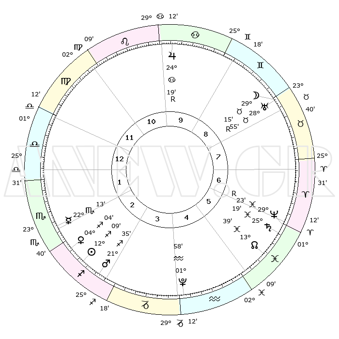 | | ΘΕΣΕΙΣ ΠΛΑΝΗΤΩΝ ΑΣΤΡΟΛΟΓΙΚΟΥ ΧΑΡΤΗ ΤΗΣ ΣΤΙΓΜΗΣ ΑΥΤΗΣ | | | | Πλανήτης | Ζώδιο | Μοίρες | Δεκαήμ. | Σε οίκο | Απόκλιση | | Ακμές των οίκων | | Ηλιος | Τοξότης | 12°07' | Δεύτερο | 2 | 22 S 14 | | 1ος | 15°58' | Ζυγός | | Σελήνη | Ταύρος | 28°45' | Τρίτο | 8 | 24 N 35 | | 2ος | 13°34' | Σκορπιός | | Ερμής | Σκορπιός | 22°11' | Τρίτο | 2 | 15 S 49 | | 3ος | 14°39' | Τοξότης | | Αφροδίτη | Τοξότης | 04°02' | Πρώτο | 2 | 20 S 22 | | 4ος | 18°03' | Αιγόκερως | | Αρης | Τοξότης | 21°34' | Τρίτο | 3 | 23 S 51 | | 5ος | 20°60' | Υδροχόος | | Δίας | Καρκίνος | 24°20'R | Τρίτο | 10 | 21 N 25 | | 6ος | 20°42' | Ιχθείς | | Κρόνος | Ιχθείς | 25°19' | Τρίτο | 6 | 04 S 02 | | 7ος | 15°58' | Κριός | | Ουρανός | Ταύρος | 28°55'R | Τρίτο | 8 | 19 N 43 | | 8ος | 13°34' | Ταύρος | | Ποσειδώνας | Ιχθείς | 29°23'R | Τρίτο | 6 | 01 S 29 | | 9ος | 14°39' | Δίδυμοι | | Πλούτωνας | Υδροχόος | 01°58' | Πρώτο | 4 | 23 S 23 | | 10ος | 18°03' | Καρκίνος | | Β. Δεσμός | Ιχθείς | 13°39' | Δεύτερο | 5 | 06 S 26 | | 11ος | 20°60' | Λέων | | Ωροσκόπος | Ζυγός | 15°58' | Δεύτερο | | | 12ος | 20°42' | Παρθένος | | Μεσουράνημα | Καρκίνος | 18°03' | Δεύτερο | | | |