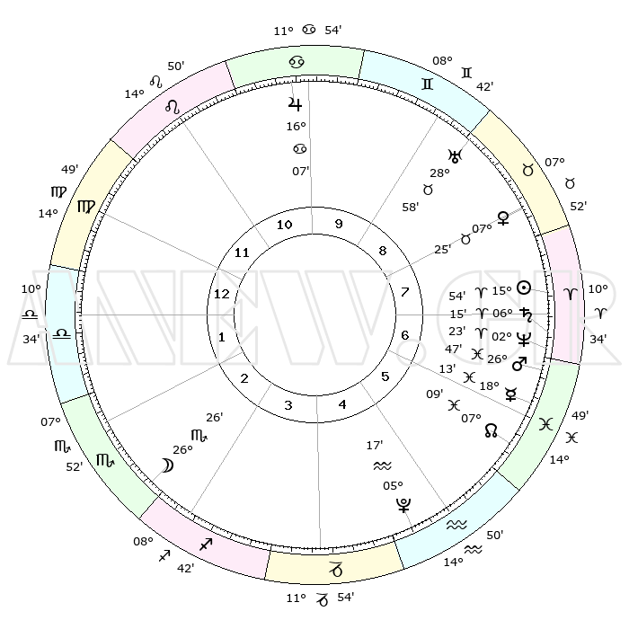 | | ΘΕΣΕΙΣ ΠΛΑΝΗΤΩΝ ΑΣΤΡΟΛΟΓΙΚΟΥ ΧΑΡΤΗ ΤΗΣ ΣΤΙΓΜΗΣ ΑΥΤΗΣ | | | | Πλανήτης | Ζώδιο | Μοίρες | Δεκαήμ. | Σε οίκο | Απόκλιση | | Ακμές των οίκων | | Ηλιος | Κριός | 15°46' | Δεύτερο | 8 | 06 N 12 | | 1ος | 29°21' | Λέων | | Σελήνη | Σκορπιός | 24°45' | Τρίτο | 4 | 23 S 49 | | 2ος | 23°09' | Παρθένος | | Ερμής | Ιχθείς | 18°04' | Δεύτερο | 7 | 06 S 29 | | 3ος | 21°45' | Ζυγός | | Αφροδίτη | Ταύρος | 07°14' | Πρώτο | 9 | 13 N 41 | | 4ος | 24°40' | Σκορπιός | | Αρης | Ιχθείς | 26°41' | Τρίτο | 8 | 02 S 16 | | 5ος | 28°54' | Τοξότης | | Δίας | Καρκίνος | 16°06' | Δεύτερο | 11 | 22 N 50 | | 6ος | 00°54' | Υδροχόος | | Κρόνος | Κριός | 06°14' | Πρώτο | 8 | 00 N 31 | | 7ος | 29°21' | Υδροχόος | | Ουρανός | Ταύρος | 28°58' | Τρίτο | 10 | 19 N 45 | | 8ος | 23°09' | Ιχθείς | | Ποσειδώνας | Κριός | 02°23' | Πρώτο | 8 | 00 S 15 | | 9ος | 21°45' | Κριός | | Πλούτωνας | Υδροχόος | 05°17' | Πρώτο | 6 | 22 S 47 | | 10ος | 24°40' | Ταύρος | | Β. Δεσμός | Ιχθείς | 07°10' | Πρώτο | 7 | 08 S 53 | | 11ος | 28°54' | Δίδυμοι | | Ωροσκόπος | Λέων | 29°21' | Τρίτο | | | 12ος | 00°54' | Λέων | | Μεσουράνημα | Ταύρος | 24°40' | Τρίτο | | | |