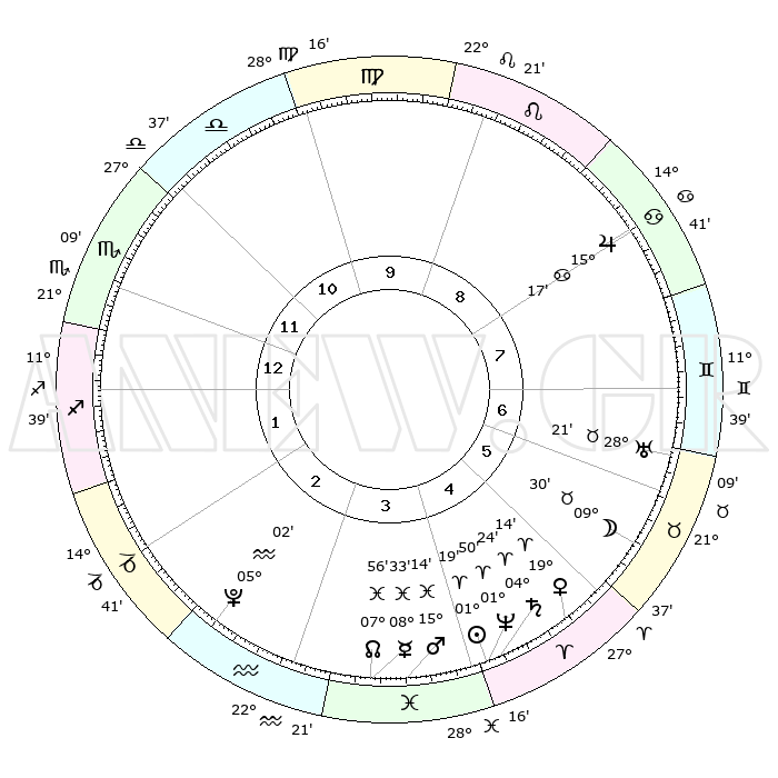 | | ΘΕΣΕΙΣ ΠΛΑΝΗΤΩΝ ΑΣΤΡΟΛΟΓΙΚΟΥ ΧΑΡΤΗ ΤΗΣ ΣΤΙΓΜΗΣ ΑΥΤΗΣ | | | | Πλανήτης | Ζώδιο | Μοίρες | Δεκαήμ. | Σε οίκο | Απόκλιση | | Ακμές των οίκων | | Ηλιος | Κριός | 01°14' | Πρώτο | 4 | 00 N 30 | | 1ος | 19°37' | Σκορπιός | | Σελήνη | Ταύρος | 08°25' | Πρώτο | 6 | 18 N 35 | | 2ος | 19°31' | Τοξότης | | Ερμής | Ιχθείς | 08°33' | Πρώτο | 4 | 07 S 41 | | 3ος | 23°38' | Αιγόκερως | | Αφροδίτη | Κριός | 19°08' | Δεύτερο | 5 | 06 N 43 | | 4ος | 29°12' | Υδροχόος | | Αρης | Ιχθείς | 15°10' | Δεύτερο | 4 | 06 S 50 | | 5ος | 01°18' | Κριός | | Δίας | Καρκίνος | 15°16' | Δεύτερο | 8 | 22 N 55 | | 6ος | 27°45' | Κριός | | Κρόνος | Κριός | 04°24' | Πρώτο | 5 | 00 S 12 | | 7ος | 19°37' | Ταύρος | | Ουρανός | Ταύρος | 28°21' | Τρίτο | 7 | 19 N 37 | | 8ος | 19°32' | Δίδυμοι | | Ποσειδώνας | Κριός | 01°50' | Πρώτο | 5 | 00 S 28 | | 9ος | 23°38' | Καρκίνος | | Πλούτωνας | Υδροχόος | 05°02' | Πρώτο | 3 | 22 S 48 | | 10ος | 29°12' | Λέων | | Β. Δεσμός | Ιχθείς | 07°56' | Πρώτο | 4 | 08 S 35 | | 11ος | 01°18' | Ζυγός | | Ωροσκόπος | Σκορπιός | 19°37' | Δεύτερο | | | 12ος | 27°45' | Ζυγός | | Μεσουράνημα | Λέων | 29°12' | Τρίτο | | | |