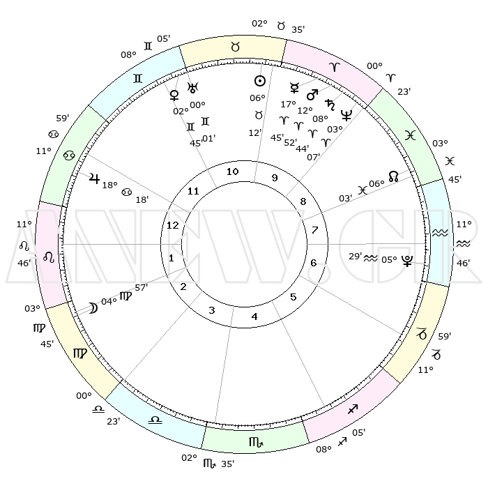 | | ΘΕΣΕΙΣ ΠΛΑΝΗΤΩΝ ΑΣΤΡΟΛΟΓΙΚΟΥ ΧΑΡΤΗ ΤΗΣ ΣΤΙΓΜΗΣ ΑΥΤΗΣ | | | | Πλανήτης | Ζώδιο | Μοίρες | Δεκαήμ. | Σε οίκο | Απόκλιση | | Ακμές των οίκων | | Ηλιος | Ταύρος | 06°09' | Πρώτο | 10 | 13 N 34 | | 1ος | 26°11' | Καρκίνος | | Σελήνη | Παρθένος | 04°15' | Πρώτο | 2 | 10 N 12 | | 2ος | 16°59' | Λέων | | Ερμής | Κριός | 17°39' | Δεύτερο | 10 | 04 N 46 | | 3ος | 11°31' | Παρθένος | | Αφροδίτη | Δίδυμοι | 02°41' | Πρώτο | 11 | 21 N 22 | | 4ος | 12°03' | Ζυγός | | Αρης | Κριός | 12°50' | Δεύτερο | 10 | 04 N 13 | | 5ος | 18°09' | Σκορπιός | | Δίας | Καρκίνος | 18°18' | Δεύτερο | 12 | 22 N 34 | | 6ος | 24°30' | Τοξότης | | Κρόνος | Κριός | 08°44' | Πρώτο | 9 | 01 N 28 | | 7ος | 26°11' | Αιγόκερως | | Ουρανός | Δίδυμοι | 00°01' | Πρώτο | 11 | 19 N 59 | | 8ος | 16°59' | Υδροχόος | | Ποσειδώνας | Κριός | 03°07' | Πρώτο | 9 | 00 N 02 | | 9ος | 11°31' | Ιχθείς | | Πλούτωνας | Υδροχόος | 05°29' | Πρώτο | 7 | 22 S 48 | | 10ος | 12°03' | Κριός | | Β. Δεσμός | Ιχθείς | 06°04' | Πρώτο | 8 | 09 S 17 | | 11ος | 18°09' | Ταύρος | | Ωροσκόπος | Καρκίνος | 26°11' | Τρίτο | | | 12ος | 24°30' | Δίδυμοι | | Μεσουράνημα | Κριός | 12°03' | Δεύτερο | | | |