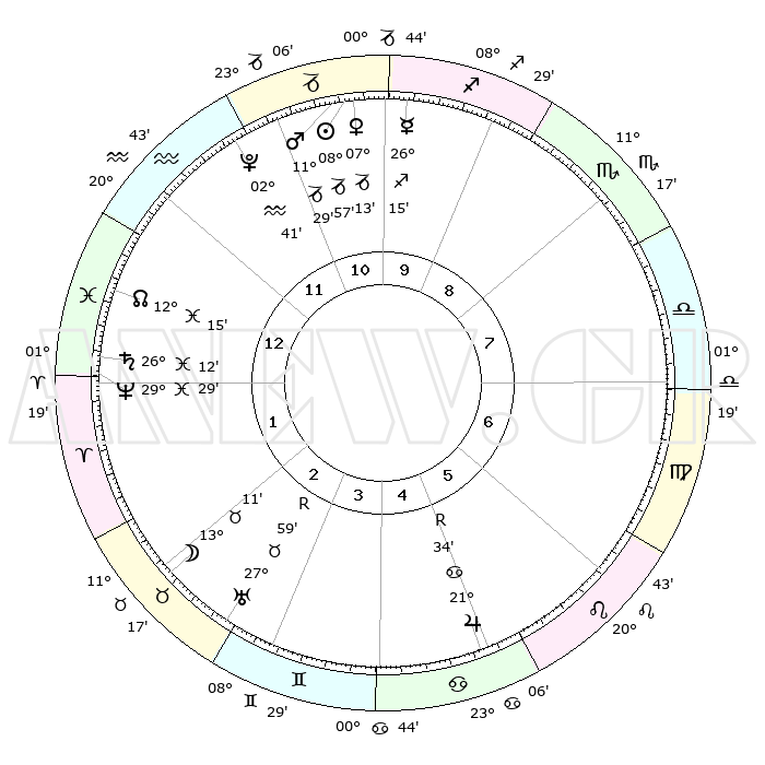 | | ΘΕΣΕΙΣ ΠΛΑΝΗΤΩΝ ΑΣΤΡΟΛΟΓΙΚΟΥ ΧΑΡΤΗ ΤΗΣ ΣΤΙΓΜΗΣ ΑΥΤΗΣ | | | | Πλανήτης | Ζώδιο | Μοίρες | Δεκαήμ. | Σε οίκο | Απόκλιση | | Ακμές των οίκων | | Ηλιος | Αιγόκερως | 08°53' | Πρώτο | 11 | 23 S 08 | | 1ος | 22°57' | Υδροχόος | | Σελήνη | Ταύρος | 12°12' | Δεύτερο | 2 | 19 N 43 | | 2ος | 08°44' | Κριός | | Ερμής | Τοξότης | 26°09' | Τρίτο | 10 | 23 S 46 | | 3ος | 12°51' | Ταύρος | | Αφροδίτη | Αιγόκερως | 07°08' | Πρώτο | 11 | 23 S 41 | | 4ος | 08°00' | Δίδυμοι | | Αρης | Αιγόκερως | 11°26' | Δεύτερο | 11 | 23 S 49 | | 5ος | 29°46' | Δίδυμοι | | Δίας | Καρκίνος | 21°34'R | Τρίτο | 5 | 21 N 56 | | 6ος | 22°39' | Καρκίνος | | Κρόνος | Ιχθείς | 26°12' | Τρίτο | 1 | 03 S 36 | | 7ος | 22°57' | Λέων | | Ουρανός | Ταύρος | 27°59'R | Τρίτο | 3 | 19 N 31 | | 8ος | 08°44' | Ζυγός | | Ποσειδώνας | Ιχθείς | 29°29' | Τρίτο | 1 | 01 S 26 | | 9ος | 12°51' | Σκορπιός | | Πλούτωνας | Υδροχόος | 02°40' | Πρώτο | 12 | 23 S 14 | | 10ος | 08°00' | Τοξότης | | Β. Δεσμός | Ιχθείς | 12°15' | Δεύτερο | 1 | 06 S 58 | | 11ος | 29°46' | Τοξότης | | Ωροσκόπος | Υδροχόος | 22°57' | Τρίτο | | | 12ος | 22°39' | Αιγόκερως | | Μεσουράνημα | Τοξότης | 08°00' | Πρώτο | | | |