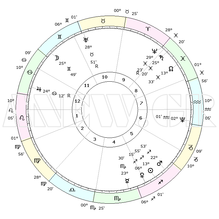 | | ΘΕΣΕΙΣ ΠΛΑΝΗΤΩΝ ΑΣΤΡΟΛΟΓΙΚΟΥ ΧΑΡΤΗ ΤΗΣ ΣΤΙΓΜΗΣ ΑΥΤΗΣ | | | | Πλανήτης | Ζώδιο | Μοίρες | Δεκαήμ. | Σε οίκο | Απόκλιση | | Ακμές των οίκων | | Ηλιος | Τοξότης | 13°52' | Δεύτερο | 5 | 22 S 28 | | 1ος | 28°09' | Καρκίνος | | Σελήνη | Δίδυμοι | 25°11' | Τρίτο | 11 | 28 N 14 | | 2ος | 19°05' | Λέων | | Ερμής | Σκορπιός | 23°28' | Τρίτο | 5 | 16 S 13 | | 3ος | 13°53' | Παρθένος | | Αφροδίτη | Τοξότης | 06°12' | Πρώτο | 5 | 20 S 49 | | 4ος | 14°41' | Ζυγός | | Αρης | Τοξότης | 22°51' | Τρίτο | 5 | 23 S 56 | | 5ος | 20°45' | Σκορπιός | | Δίας | Καρκίνος | 24°12'R | Τρίτο | 12 | 21 N 26 | | 6ος | 26°46' | Τοξότης | | Κρόνος | Ιχθείς | 25°20' | Τρίτο | 9 | 04 S 01 | | 7ος | 28°09' | Αιγόκερως | | Ουρανός | Ταύρος | 28°51'R | Τρίτο | 11 | 19 N 42 | | 8ος | 19°05' | Υδροχόος | | Ποσειδώνας | Ιχθείς | 29°23'R | Τρίτο | 9 | 01 S 29 | | 9ος | 13°53' | Ιχθείς | | Πλούτωνας | Υδροχόος | 02°01' | Πρώτο | 7 | 23 S 23 | | 10ος | 14°41' | Κριός | | Β. Δεσμός | Ιχθείς | 13°33' | Δεύτερο | 8 | 06 S 28 | | 11ος | 20°45' | Ταύρος | | Ωροσκόπος | Καρκίνος | 28°09' | Τρίτο | | | 12ος | 26°46' | Δίδυμοι | | Μεσουράνημα | Κριός | 14°41' | Δεύτερο | | | |