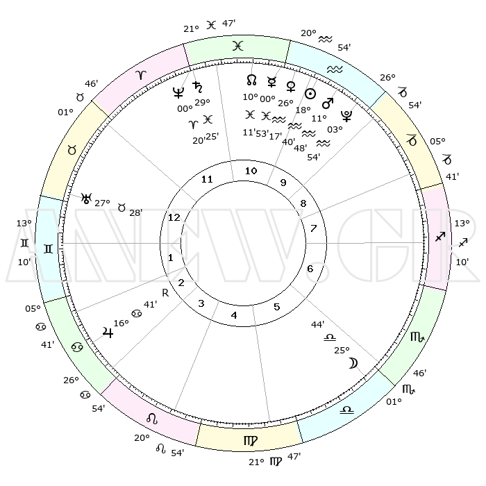 | | ΘΕΣΕΙΣ ΠΛΑΝΗΤΩΝ ΑΣΤΡΟΛΟΓΙΚΟΥ ΧΑΡΤΗ ΤΗΣ ΣΤΙΓΜΗΣ ΑΥΤΗΣ | | | | Πλανήτης | Ζώδιο | Μοίρες | Δεκαήμ. | Σε οίκο | Απόκλιση | | Ακμές των οίκων | | Ηλιος | Υδροχόος | 18°36' | Δεύτερο | 10 | 15 S 15 | | 1ος | 14°37' | Ταύρος | | Σελήνη | Ζυγός | 24°55' | Τρίτο | 6 | 13 S 09 | | 2ος | 12°57' | Δίδυμοι | | Ερμής | Ιχθείς | 00°46' | Πρώτο | 11 | 12 S 24 | | 3ος | 05°13' | Καρκίνος | | Αφροδίτη | Υδροχόος | 26°12' | Τρίτο | 11 | 14 S 08 | | 4ος | 27°10' | Καρκίνος | | Αρης | Υδροχόος | 11°44' | Δεύτερο | 10 | 18 S 17 | | 5ος | 23°16' | Λέων | | Δίας | Καρκίνος | 16°41'R | Δεύτερο | 3 | 22 N 42 | | 6ος | 28°54' | Παρθένος | | Κρόνος | Ιχθείς | 29°24' | Τρίτο | 12 | 02 S 13 | | 7ος | 14°37' | Σκορπιός | | Ουρανός | Ταύρος | 27°28' | Τρίτο | 1 | 19 N 24 | | 8ος | 12°57' | Τοξότης | | Ποσειδώνας | Κριός | 00°20' | Πρώτο | 12 | 01 S 04 | | 9ος | 05°13' | Αιγόκερως | | Πλούτωνας | Υδροχόος | 03°54' | Πρώτο | 10 | 22 S 59 | | 10ος | 27°10' | Αιγόκερως | | Β. Δεσμός | Ιχθείς | 10°11' | Δεύτερο | 11 | 07 S 45 | | 11ος | 23°16' | Υδροχόος | | Ωροσκόπος | Ταύρος | 14°37' | Δεύτερο | | | 12ος | 28°54' | Ιχθείς | | Μεσουράνημα | Αιγόκερως | 27°10' | Τρίτο | | | |