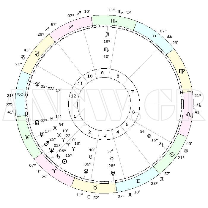 | | ΘΕΣΕΙΣ ΠΛΑΝΗΤΩΝ ΑΣΤΡΟΛΟΓΙΚΟΥ ΧΑΡΤΗ ΤΗΣ ΣΤΙΓΜΗΣ ΑΥΤΗΣ | | | | Πλανήτης | Ζώδιο | Μοίρες | Δεκαήμ. | Σε οίκο | Απόκλιση | | Ακμές των οίκων | | Ηλιος | Κριός | 15°06' | Δεύτερο | 4 | 05 N 57 | | 1ος | 07°18' | Τοξότης | | Σελήνη | Σκορπιός | 16°45' | Δεύτερο | 12 | 21 S 26 | | 2ος | 09°33' | Αιγόκερως | | Ερμής | Ιχθείς | 17°22' | Δεύτερο | 3 | 06 S 41 | | 3ος | 16°29' | Υδροχόος | | Αφροδίτη | Ταύρος | 06°25' | Πρώτο | 5 | 13 N 24 | | 4ος | 22°33' | Ιχθείς | | Αρης | Ιχθείς | 26°10' | Τρίτο | 4 | 02 S 28 | | 5ος | 22°34' | Κριός | | Δίας | Καρκίνος | 16°03' | Δεύτερο | 8 | 22 N 50 | | 6ος | 16°39' | Ταύρος | | Κρόνος | Κριός | 06°09' | Πρώτο | 4 | 00 N 29 | | 7ος | 07°18' | Δίδυμοι | | Ουρανός | Ταύρος | 28°56' | Τρίτο | 6 | 19 N 45 | | 8ος | 09°33' | Καρκίνος | | Ποσειδώνας | Κριός | 02°21' | Πρώτο | 4 | 00 S 16 | | 9ος | 16°29' | Λέων | | Πλούτωνας | Υδροχόος | 05°17' | Πρώτο | 2 | 22 S 47 | | 10ος | 22°33' | Παρθένος | | Β. Δεσμός | Ιχθείς | 07°12' | Πρώτο | 3 | 08 S 52 | | 11ος | 22°34' | Ζυγός | | Ωροσκόπος | Τοξότης | 07°18' | Πρώτο | | | 12ος | 16°39' | Σκορπιός | | Μεσουράνημα | Παρθένος | 22°33' | Τρίτο | | | |