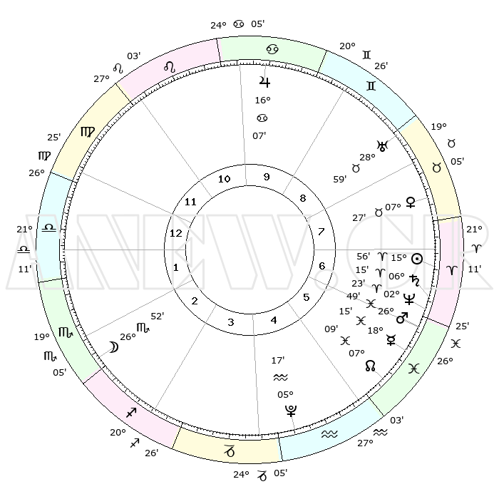 | | ΘΕΣΕΙΣ ΠΛΑΝΗΤΩΝ ΑΣΤΡΟΛΟΓΙΚΟΥ ΧΑΡΤΗ ΤΗΣ ΣΤΙΓΜΗΣ ΑΥΤΗΣ | | | | Πλανήτης | Ζώδιο | Μοίρες | Δεκαήμ. | Σε οίκο | Απόκλιση | | Ακμές των οίκων | | Ηλιος | Κριός | 15°50' | Δεύτερο | 8 | 06 N 14 | | 1ος | 19°04' | Παρθένος | | Σελήνη | Σκορπιός | 25°33' | Τρίτο | 3 | 24 S 02 | | 2ος | 14°48' | Ζυγός | | Ερμής | Ιχθείς | 18°08' | Δεύτερο | 6 | 06 S 28 | | 3ος | 14°46' | Σκορπιός | | Αφροδίτη | Ταύρος | 07°19' | Πρώτο | 8 | 13 N 43 | | 4ος | 17°41' | Τοξότης | | Αρης | Ιχθείς | 26°44' | Τρίτο | 7 | 02 S 15 | | 5ος | 20°54' | Αιγόκερως | | Δίας | Καρκίνος | 16°07' | Δεύτερο | 10 | 22 N 50 | | 6ος | 21°46' | Υδροχόος | | Κρόνος | Κριός | 06°14' | Πρώτο | 7 | 00 N 31 | | 7ος | 19°04' | Ιχθείς | | Ουρανός | Ταύρος | 28°58' | Τρίτο | 9 | 19 N 45 | | 8ος | 14°48' | Κριός | | Ποσειδώνας | Κριός | 02°23' | Πρώτο | 7 | 00 S 15 | | 9ος | 14°46' | Ταύρος | | Πλούτωνας | Υδροχόος | 05°17' | Πρώτο | 5 | 22 S 47 | | 10ος | 17°41' | Δίδυμοι | | Β. Δεσμός | Ιχθείς | 07°10' | Πρώτο | 6 | 08 S 53 | | 11ος | 20°54' | Καρκίνος | | Ωροσκόπος | Παρθένος | 19°04' | Δεύτερο | | | 12ος | 21°46' | Λέων | | Μεσουράνημα | Δίδυμοι | 17°41' | Δεύτερο | | | |