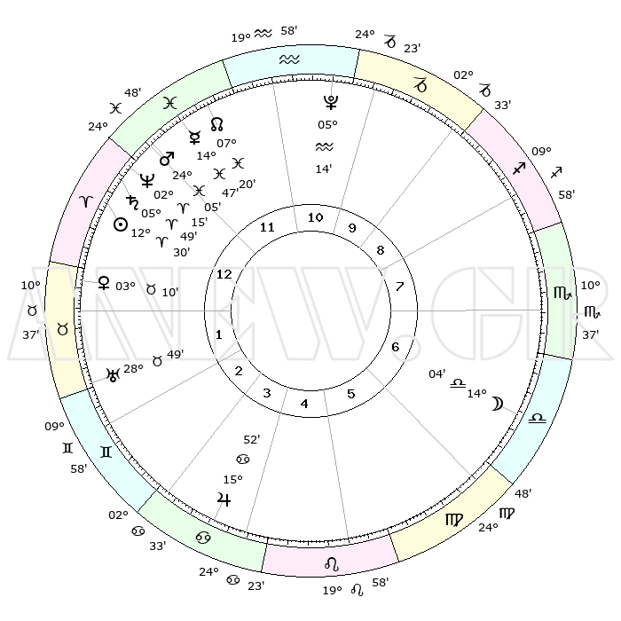 | | ΘΕΣΕΙΣ ΠΛΑΝΗΤΩΝ ΑΣΤΡΟΛΟΓΙΚΟΥ ΧΑΡΤΗ ΤΗΣ ΣΤΙΓΜΗΣ ΑΥΤΗΣ | | | | Πλανήτης | Ζώδιο | Μοίρες | Δεκαήμ. | Σε οίκο | Απόκλιση | | Ακμές των οίκων | | Ηλιος | Κριός | 12°26' | Δεύτερο | 1 | 04 N 55 | | 1ος | 10°58' | Κριός | | Σελήνη | Ζυγός | 13°23' | Δεύτερο | 7 | 08 S 00 | | 2ος | 18°27' | Ταύρος | | Ερμής | Ιχθείς | 14°44' | Δεύτερο | 12 | 07 S 23 | | 3ος | 14°16' | Δίδυμοι | | Αφροδίτη | Ταύρος | 03°06' | Πρώτο | 1 | 12 N 10 | | 4ος | 06°11' | Καρκίνος | | Αρης | Ιχθείς | 24°03' | Τρίτο | 12 | 03 S 19 | | 5ος | 29°04' | Καρκίνος | | Δίας | Καρκίνος | 15°52' | Δεύτερο | 4 | 22 N 52 | | 6ος | 28°15' | Λέων | | Κρόνος | Κριός | 05°48' | Πρώτο | 12 | 00 N 21 | | 7ος | 10°58' | Ζυγός | | Ουρανός | Ταύρος | 28°49' | Τρίτο | 2 | 19 N 43 | | 8ος | 18°27' | Σκορπιός | | Ποσειδώνας | Κριός | 02°15' | Πρώτο | 12 | 00 S 18 | | 9ος | 14°16' | Τοξότης | | Πλούτωνας | Υδροχόος | 05°14' | Πρώτο | 11 | 22 S 47 | | 10ος | 06°11' | Αιγόκερως | | Β. Δεσμός | Ιχθείς | 07°20' | Πρώτο | 12 | 08 S 49 | | 11ος | 29°04' | Αιγόκερως | | Ωροσκόπος | Κριός | 10°58' | Δεύτερο | | | 12ος | 28°15' | Υδροχόος | | Μεσουράνημα | Αιγόκερως | 06°11' | Πρώτο | | | |