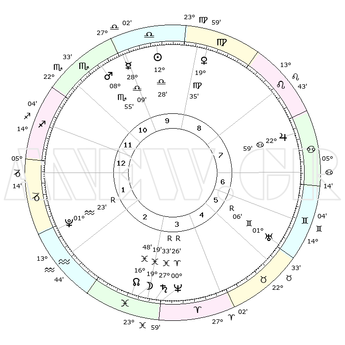 | ΘΕΣΕΙΣ ΠΛΑΝΗΤΩΝ ΑΣΤΡΟΛΟΓΙΚΟΥ ΧΑΡΤΗ ΤΗΣ ΣΤΙΓΜΗΣ ΑΥΤΗΣ | | Πλανήτης | Ζώδιο | Μοίρες | Δεκαήμ. | Σε οίκο | Απόκλιση | | Ακμές των οίκων | Ηλιος | Ζυγός | 12°21' | Δεύτερο | 10 | 04 S 53 | | 1ος | 28°60' | Σκορπιός | Σελήνη | Ιχθείς | 17°39' | Δεύτερο | 4 | 04 S 56 | | 2ος | 29°59' | Τοξότης | Ερμής | Ζυγός | 27°58' | Τρίτο | 11 | 11 S 20 | | 3ος | 05°32' | Υδροχόος | Αφροδίτη | Παρθένος | 19°26' | Δεύτερο | 10 | 05 N 27 | | 4ος | 11°33' | Ιχθείς | Αρης | Σκορπιός | 08°51' | Πρώτο | 12 | 14 S 34 | | 5ος | 12°42' | Κριός | Δίας | Καρκίνος | 22°58' | Τρίτο | 8 | 21 N 30 | | 6ος | 07°53' | Ταύρος | Κρόνος | Ιχθείς | 27°34'R | Τρίτο | 4 | 03 S 16 | | 7ος | 28°60' | Ταύρος | Ουρανός | Δίδυμοι | 01°07'R | Πρώτο | 7 | 20 N 10 | | 8ος | 29°59' | Δίδυμοι | Ποσειδώνας | Κριός | 00°26'R | Πρώτο | 4 | 01 S 05 | | 9ος | 05°32' | Λέων | Πλούτωνας | Υδροχόος | 01°23'R | Πρώτο | 2 | 23 S 32 | | 10ος | 11°33' | Παρθένος | Β. Δεσμός | Ιχθείς | 16°49' | Δεύτερο | 4 | 05 S 12 | | 11ος | 12°42' | Ζυγός | Ωροσκόπος | Σκορπιός | 28°60' | Τρίτο | | | 12ος | 07°53' | Σκορπιός | Μεσουράνημα | Παρθένος | 11°33' | Δεύτερο | | | |