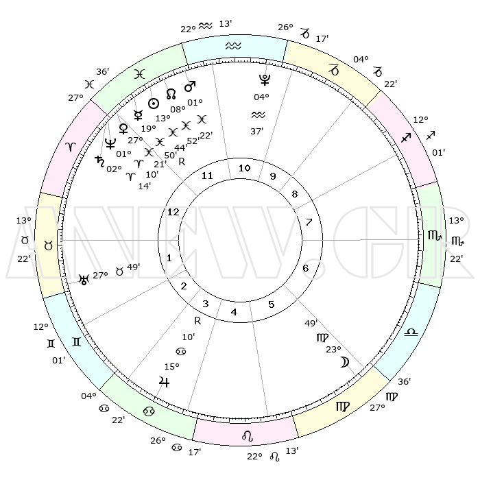 | | ΘΕΣΕΙΣ ΠΛΑΝΗΤΩΝ ΑΣΤΡΟΛΟΓΙΚΟΥ ΧΑΡΤΗ ΤΗΣ ΣΤΙΓΜΗΣ ΑΥΤΗΣ | | | | Πλανήτης | Ζώδιο | Μοίρες | Δεκαήμ. | Σε οίκο | Απόκλιση | | Ακμές των οίκων | | Ηλιος | Ιχθείς | 13°41' | Δεύτερο | 12 | 06 S 25 | | 1ος | 14°35' | Κριός | | Σελήνη | Παρθένος | 23°07' | Τρίτο | 6 | 01 N 33 | | 2ος | 21°05' | Ταύρος | | Ερμής | Ιχθείς | 19°53'R | Δεύτερο | 12 | 00 S 39 | | 3ος | 16°26' | Δίδυμοι | | Αφροδίτη | Ιχθείς | 27°17' | Τρίτο | 12 | 02 S 17 | | 4ος | 08°15' | Καρκίνος | | Αρης | Ιχθείς | 01°19' | Πρώτο | 12 | 12 S 02 | | 5ος | 01°23' | Λέων | | Δίας | Καρκίνος | 15°10'R | Δεύτερο | 4 | 22 N 55 | | 6ος | 01°12' | Παρθένος | | Κρόνος | Κριός | 02°14' | Πρώτο | 12 | 01 S 04 | | 7ος | 14°35' | Ζυγός | | Ουρανός | Ταύρος | 27°48' | Τρίτο | 2 | 19 N 30 | | 8ος | 21°05' | Σκορπιός | | Ποσειδώνας | Κριός | 01°10' | Πρώτο | 12 | 00 S 44 | | 9ος | 16°26' | Τοξότης | | Πλούτωνας | Υδροχόος | 04°37' | Πρώτο | 11 | 22 S 52 | | 10ος | 08°15' | Αιγόκερως | | Β. Δεσμός | Ιχθείς | 08°52' | Πρώτο | 12 | 08 S 14 | | 11ος | 01°23' | Υδροχόος | | Ωροσκόπος | Κριός | 14°35' | Δεύτερο | | | 12ος | 01°12' | Ιχθείς | | Μεσουράνημα | Αιγόκερως | 08°15' | Πρώτο | | | |