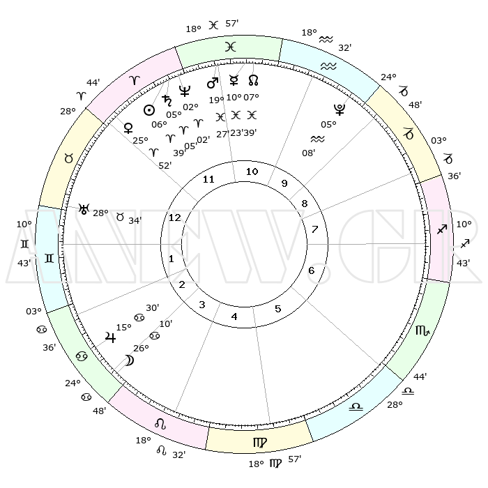 | | ΘΕΣΕΙΣ ΠΛΑΝΗΤΩΝ ΑΣΤΡΟΛΟΓΙΚΟΥ ΧΑΡΤΗ ΤΗΣ ΣΤΙΓΜΗΣ ΑΥΤΗΣ | | | | Πλανήτης | Ζώδιο | Μοίρες | Δεκαήμ. | Σε οίκο | Απόκλιση | | Ακμές των οίκων | | Ηλιος | Κριός | 06°36' | Πρώτο | 12 | 02 N 37 | | 1ος | 19°29' | Ταύρος | | Σελήνη | Καρκίνος | 25°29' | Τρίτο | 3 | 24 N 34 | | 2ος | 16°37' | Δίδυμοι | | Ερμής | Ιχθείς | 10°22' | Δεύτερο | 11 | 08 S 06 | | 3ος | 08°34' | Καρκίνος | | Αφροδίτη | Κριός | 25°49' | Τρίτο | 12 | 09 N 23 | | 4ος | 00°42' | Λέων | | Αρης | Ιχθείς | 19°25' | Δεύτερο | 11 | 05 S 10 | | 5ος | 27°29' | Λέων | | Δίας | Καρκίνος | 15°30' | Δεύτερο | 3 | 22 N 54 | | 6ος | 04°05' | Ζυγός | | Κρόνος | Κριός | 05°04' | Πρώτο | 12 | 00 N 04 | | 7ος | 19°29' | Σκορπιός | | Ουρανός | Ταύρος | 28°34' | Τρίτο | 1 | 19 N 40 | | 8ος | 16°37' | Τοξότης | | Ποσειδώνας | Κριός | 02°02' | Πρώτο | 11 | 00 S 24 | | 9ος | 08°34' | Αιγόκερως | | Πλούτωνας | Υδροχόος | 05°08' | Πρώτο | 10 | 22 S 48 | | 10ος | 00°42' | Υδροχόος | | Β. Δεσμός | Ιχθείς | 07°39' | Πρώτο | 11 | 08 S 42 | | 11ος | 27°29' | Υδροχόος | | Ωροσκόπος | Ταύρος | 19°29' | Δεύτερο | | | 12ος | 04°05' | Κριός | | Μεσουράνημα | Υδροχόος | 00°42' | Πρώτο | | | |