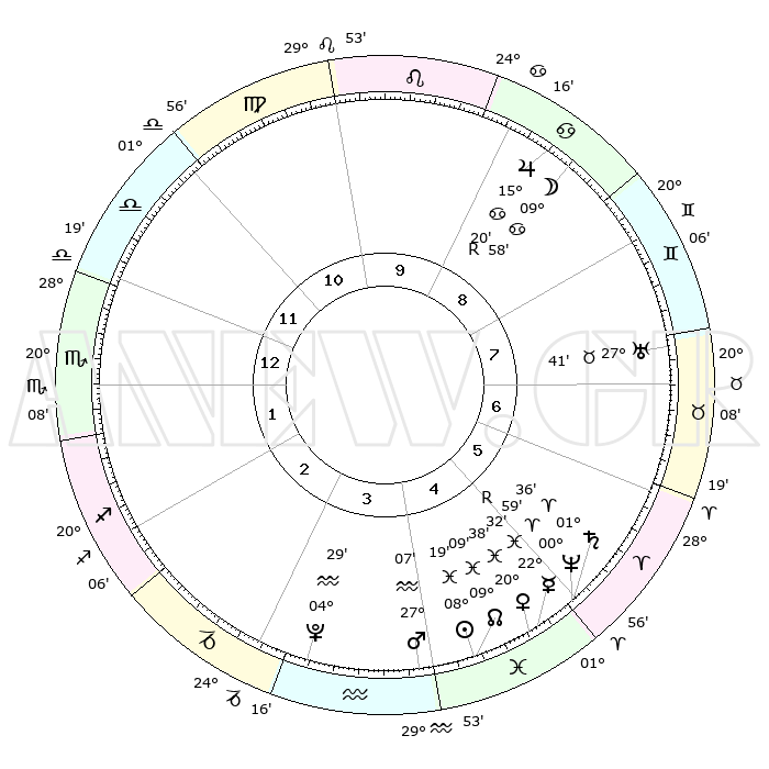 | | ΘΕΣΕΙΣ ΠΛΑΝΗΤΩΝ ΑΣΤΡΟΛΟΓΙΚΟΥ ΧΑΡΤΗ ΤΗΣ ΣΤΙΓΜΗΣ ΑΥΤΗΣ | | | | Πλανήτης | Ζώδιο | Μοίρες | Δεκαήμ. | Σε οίκο | Απόκλιση | | Ακμές των οίκων | | Ηλιος | Ιχθείς | 08°16' | Πρώτο | 4 | 08 S 28 | | 1ος | 02°14' | Σκορπιός | | Σελήνη | Καρκίνος | 09°06' | Πρώτο | 9 | 27 N 41 | | 2ος | 00°47' | Τοξότης | | Ερμής | Ιχθείς | 22°32'R | Τρίτο | 5 | 00 S 17 | | 3ος | 02°55' | Αιγόκερως | | Αφροδίτη | Ιχθείς | 20°33' | Τρίτο | 5 | 05 S 01 | | 4ος | 07°16' | Υδροχόος | | Αρης | Υδροχόος | 27°04' | Τρίτο | 4 | 13 S 31 | | 5ος | 10°09' | Ιχθείς | | Δίας | Καρκίνος | 15°20'R | Δεύτερο | 9 | 22 N 54 | | 6ος | 08°37' | Κριός | | Κρόνος | Κριός | 01°35' | Πρώτο | 5 | 01 S 20 | | 7ος | 02°14' | Ταύρος | | Ουρανός | Ταύρος | 27°41' | Τρίτο | 7 | 19 N 28 | | 8ος | 00°47' | Δίδυμοι | | Ποσειδώνας | Κριός | 00°58' | Πρώτο | 5 | 00 S 49 | | 9ος | 02°55' | Καρκίνος | | Πλούτωνας | Υδροχόος | 04°29' | Πρώτο | 3 | 22 S 53 | | 10ος | 07°16' | Λέων | | Β. Δεσμός | Ιχθείς | 09°09' | Πρώτο | 4 | 08 S 08 | | 11ος | 10°09' | Παρθένος | | Ωροσκόπος | Σκορπιός | 02°14' | Πρώτο | | | 12ος | 08°37' | Ζυγός | | Μεσουράνημα | Λέων | 07°16' | Πρώτο | | | |
