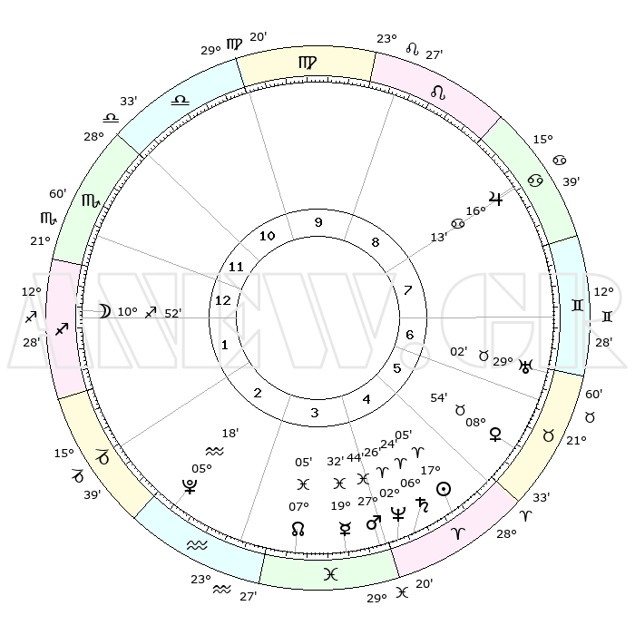 | | ΘΕΣΕΙΣ ΠΛΑΝΗΤΩΝ ΑΣΤΡΟΛΟΓΙΚΟΥ ΧΑΡΤΗ ΤΗΣ ΣΤΙΓΜΗΣ ΑΥΤΗΣ | | | | Πλανήτης | Ζώδιο | Μοίρες | Δεκαήμ. | Σε οίκο | Απόκλιση | | Ακμές των οίκων | | Ηλιος | Κριός | 17°01' | Δεύτερο | 5 | 06 N 41 | | 1ος | 23°26' | Σκορπιός | | Σελήνη | Τοξότης | 10°06' | Δεύτερο | 1 | 27 S 04 | | 2ος | 23°44' | Τοξότης | | Ερμής | Ιχθείς | 19°28' | Δεύτερο | 4 | 06 S 04 | | 3ος | 28°24' | Αιγόκερως | | Αφροδίτη | Ταύρος | 08°49' | Πρώτο | 6 | 14 N 15 | | 4ος | 04°11' | Ιχθείς | | Αρης | Ιχθείς | 27°41' | Τρίτο | 4 | 01 S 52 | | 5ος | 05°57' | Κριός | | Δίας | Καρκίνος | 16°13' | Δεύτερο | 8 | 22 N 49 | | 6ος | 01°54' | Ταύρος | | Κρόνος | Κριός | 06°23' | Πρώτο | 5 | 00 N 34 | | 7ος | 23°26' | Ταύρος | | Ουρανός | Ταύρος | 29°02' | Τρίτο | 7 | 19 N 46 | | 8ος | 23°44' | Δίδυμοι | | Ποσειδώνας | Κριός | 02°26' | Πρώτο | 4 | 00 S 14 | | 9ος | 28°24' | Καρκίνος | | Πλούτωνας | Υδροχόος | 05°18' | Πρώτο | 3 | 22 S 47 | | 10ος | 04°11' | Παρθένος | | Β. Δεσμός | Ιχθείς | 07°06' | Πρώτο | 4 | 08 S 54 | | 11ος | 05°57' | Ζυγός | | Ωροσκόπος | Σκορπιός | 23°26' | Τρίτο | | | 12ος | 01°54' | Σκορπιός | | Μεσουράνημα | Παρθένος | 04°11' | Πρώτο | | | |