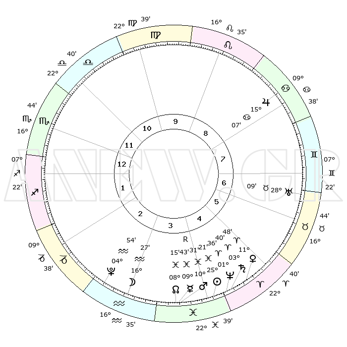 | | ΘΕΣΕΙΣ ΠΛΑΝΗΤΩΝ ΑΣΤΡΟΛΟΓΙΚΟΥ ΧΑΡΤΗ ΤΗΣ ΣΤΙΓΜΗΣ ΑΥΤΗΣ | | | | Πλανήτης | Ζώδιο | Μοίρες | Δεκαήμ. | Σε οίκο | Απόκλιση | | Ακμές των οίκων | | Ηλιος | Ιχθείς | 25°17' | Τρίτο | 4 | 01 S 52 | | 1ος | 18°54' | Σκορπιός | | Σελήνη | Υδροχόος | 15°38' | Δεύτερο | 3 | 18 S 08 | | 2ος | 18°44' | Τοξότης | | Ερμής | Ιχθείς | 09°45'R | Πρώτο | 4 | 05 S 52 | | 3ος | 22°44' | Αιγόκερως | | Αφροδίτη | Κριός | 11°43' | Δεύτερο | 5 | 03 N 42 | | 4ος | 28°16' | Υδροχόος | | Αρης | Ιχθείς | 10°28' | Δεύτερο | 4 | 08 S 39 | | 5ος | 00°25' | Κριός | | Δίας | Καρκίνος | 15°07' | Δεύτερο | 8 | 22 N 56 | | 6ος | 26°58' | Κριός | | Κρόνος | Κριός | 03°39' | Πρώτο | 5 | 00 S 30 | | 7ος | 18°54' | Ταύρος | | Ουρανός | Ταύρος | 28°09' | Τρίτο | 7 | 19 N 34 | | 8ος | 18°44' | Δίδυμοι | | Ποσειδώνας | Κριός | 01°36' | Πρώτο | 5 | 00 S 34 | | 9ος | 22°44' | Καρκίνος | | Πλούτωνας | Υδροχόος | 04°54' | Πρώτο | 3 | 22 S 49 | | 10ος | 28°16' | Λέων | | Β. Δεσμός | Ιχθείς | 08°15' | Πρώτο | 4 | 08 S 28 | | 11ος | 00°25' | Ζυγός | | Ωροσκόπος | Σκορπιός | 18°54' | Δεύτερο | | | 12ος | 26°58' | Ζυγός | | Μεσουράνημα | Λέων | 28°16' | Τρίτο | | | |