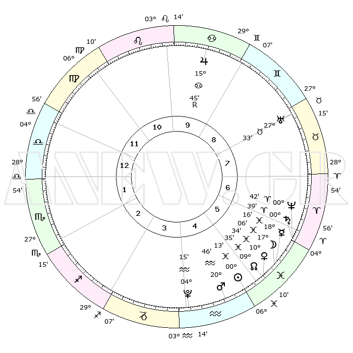 | | ΘΕΣΕΙΣ ΠΛΑΝΗΤΩΝ ΑΣΤΡΟΛΟΓΙΚΟΥ ΧΑΡΤΗ ΤΗΣ ΣΤΙΓΜΗΣ ΑΥΤΗΣ | | | | Πλανήτης | Ζώδιο | Μοίρες | Δεκαήμ. | Σε οίκο | Απόκλιση | | Ακμές των οίκων | | Ηλιος | Ιχθείς | 00°08' | Πρώτο | 5 | 11 S 25 | | 1ος | 07°07' | Ζυγός | | Σελήνη | Ιχθείς | 16°05' | Δεύτερο | 6 | 04 S 53 | | 2ος | 04°12' | Σκορπιός | | Ερμής | Ιχθείς | 18°11' | Δεύτερο | 6 | 03 S 48 | | 3ος | 04°54' | Τοξότης | | Αφροδίτη | Ιχθείς | 10°29' | Δεύτερο | 5 | 08 S 59 | | 4ος | 08°00' | Αιγόκερως | | Αρης | Υδροχόος | 20°43' | Τρίτο | 5 | 15 S 37 | | 5ος | 10°56' | Υδροχόος | | Δίας | Καρκίνος | 15°45'R | Δεύτερο | 10 | 22 N 50 | | 6ος | 11°05' | Ιχθείς | | Κρόνος | Κριός | 00°39' | Πρώτο | 6 | 01 S 42 | | 7ος | 07°07' | Κριός | | Ουρανός | Ταύρος | 27°33' | Τρίτο | 8 | 19 N 26 | | 8ος | 04°12' | Ταύρος | | Ποσειδώνας | Κριός | 00°42' | Πρώτο | 6 | 00 S 56 | | 9ος | 04°54' | Δίδυμοι | | Πλούτωνας | Υδροχόος | 04°15' | Πρώτο | 4 | 22 S 55 | | 10ος | 08°00' | Καρκίνος | | Β. Δεσμός | Ιχθείς | 09°35' | Πρώτο | 5 | 07 S 58 | | 11ος | 10°56' | Λέων | | Ωροσκόπος | Ζυγός | 07°07' | Πρώτο | | | 12ος | 11°05' | Παρθένος | | Μεσουράνημα | Καρκίνος | 08°00' | Πρώτο | | | |