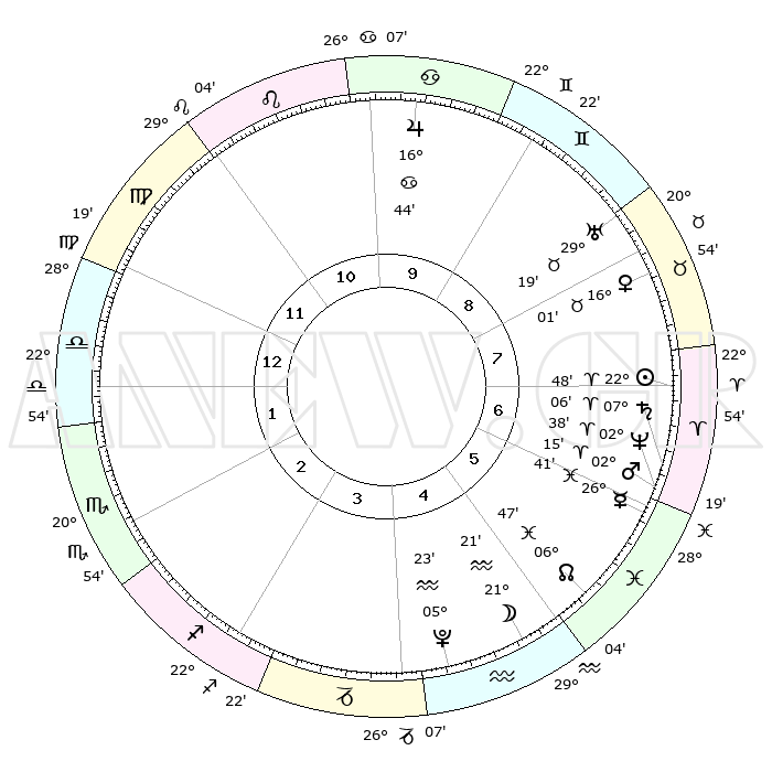 | | ΘΕΣΕΙΣ ΠΛΑΝΗΤΩΝ ΑΣΤΡΟΛΟΓΙΚΟΥ ΧΑΡΤΗ ΤΗΣ ΣΤΙΓΜΗΣ ΑΥΤΗΣ | | | | Πλανήτης | Ζώδιο | Μοίρες | Δεκαήμ. | Σε οίκο | Απόκλιση | | Ακμές των οίκων | | Ηλιος | Κριός | 22°44' | Τρίτο | 7 | 08 N 51 | | 1ος | 04°20' | Ζυγός | | Σελήνη | Υδροχόος | 20°32' | Τρίτο | 5 | 16 S 07 | | 2ος | 01°13' | Σκορπιός | | Ερμής | Ιχθείς | 26°36' | Τρίτο | 6 | 03 S 39 | | 3ος | 01°49' | Τοξότης | | Αφροδίτη | Ταύρος | 15°57' | Δεύτερο | 8 | 16 N 40 | | 4ος | 04°52' | Αιγόκερως | | Αρης | Κριός | 02°12' | Πρώτο | 6 | 00 S 02 | | 5ος | 07°49' | Υδροχόος | | Δίας | Καρκίνος | 16°44' | Δεύτερο | 10 | 22 N 46 | | 6ος | 08°04' | Ιχθείς | | Κρόνος | Κριός | 07°06' | Πρώτο | 7 | 00 N 51 | | 7ος | 04°20' | Κριός | | Ουρανός | Ταύρος | 29°18' | Τρίτο | 8 | 19 N 50 | | 8ος | 01°14' | Ταύρος | | Ποσειδώνας | Κριός | 02°38' | Πρώτο | 6 | 00 S 09 | | 9ος | 01°49' | Δίδυμοι | | Πλούτωνας | Υδροχόος | 05°23' | Πρώτο | 4 | 22 S 47 | | 10ος | 04°52' | Καρκίνος | | Β. Δεσμός | Ιχθείς | 06°47' | Πρώτο | 5 | 09 S 01 | | 11ος | 07°49' | Λέων | | Ωροσκόπος | Ζυγός | 04°20' | Πρώτο | | | 12ος | 08°04' | Παρθένος | | Μεσουράνημα | Καρκίνος | 04°52' | Πρώτο | | | |