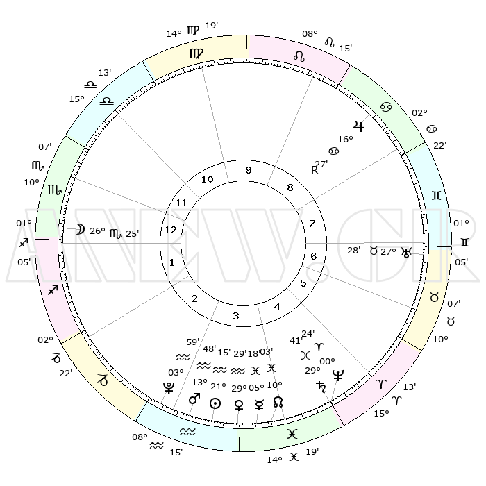 | | ΘΕΣΕΙΣ ΠΛΑΝΗΤΩΝ ΑΣΤΡΟΛΟΓΙΚΟΥ ΧΑΡΤΗ ΤΗΣ ΣΤΙΓΜΗΣ ΑΥΤΗΣ | | | | Πλανήτης | Ζώδιο | Μοίρες | Δεκαήμ. | Σε οίκο | Απόκλιση | | Ακμές των οίκων | | Ηλιος | Υδροχόος | 21°12' | Τρίτο | 3 | 14 S 26 | | 1ος | 14°57' | Σκορπιός | | Σελήνη | Σκορπιός | 25°46' | Τρίτο | 1 | 24 S 09 | | 2ος | 14°25' | Τοξότης | | Ερμής | Ιχθείς | 05°12' | Πρώτο | 4 | 10 S 27 | | 3ος | 17°53' | Αιγόκερως | | Αφροδίτη | Υδροχόος | 29°25' | Τρίτο | 4 | 13 S 02 | | 4ος | 23°10' | Υδροχόος | | Αρης | Υδροχόος | 13°45' | Δεύτερο | 3 | 17 S 43 | | 5ος | 25°35' | Ιχθείς | | Δίας | Καρκίνος | 16°27'R | Δεύτερο | 8 | 22 N 44 | | 6ος | 22°38' | Κριός | | Κρόνος | Ιχθείς | 29°41' | Τρίτο | 5 | 02 S 06 | | 7ος | 14°57' | Ταύρος | | Ουρανός | Ταύρος | 27°28' | Τρίτο | 7 | 19 N 25 | | 8ος | 14°25' | Δίδυμοι | | Ποσειδώνας | Κριός | 00°24' | Πρώτο | 5 | 01 S 03 | | 9ος | 17°53' | Καρκίνος | | Πλούτωνας | Υδροχόος | 03°59' | Πρώτο | 3 | 22 S 58 | | 10ος | 23°10' | Λέων | | Β. Δεσμός | Ιχθείς | 10°03' | Δεύτερο | 4 | 07 S 48 | | 11ος | 25°35' | Παρθένος | | Ωροσκόπος | Σκορπιός | 14°57' | Δεύτερο | | | 12ος | 22°38' | Ζυγός | | Μεσουράνημα | Λέων | 23°10' | Τρίτο | | | |