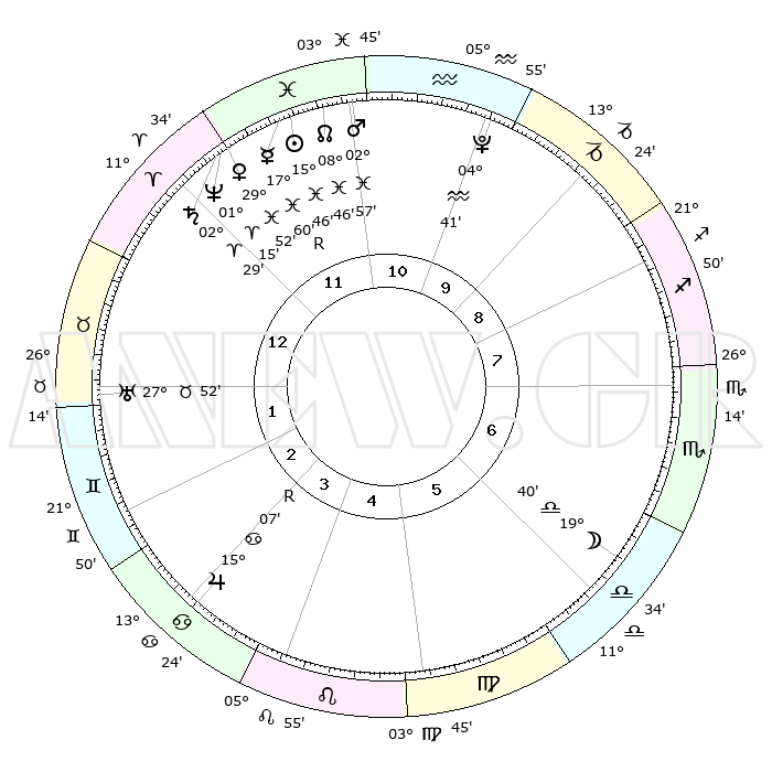 | | ΘΕΣΕΙΣ ΠΛΑΝΗΤΩΝ ΑΣΤΡΟΛΟΓΙΚΟΥ ΧΑΡΤΗ ΤΗΣ ΣΤΙΓΜΗΣ ΑΥΤΗΣ | | | | Πλανήτης | Ζώδιο | Μοίρες | Δεκαήμ. | Σε οίκο | Απόκλιση | | Ακμές των οίκων | | Ηλιος | Ιχθείς | 15°42' | Δεύτερο | 12 | 05 S 38 | | 1ος | 27°04' | Κριός | | Σελήνη | Ζυγός | 18°56' | Δεύτερο | 6 | 10 S 33 | | 2ος | 00°06' | Δίδυμοι | | Ερμής | Ιχθείς | 18°03'R | Δεύτερο | 12 | 01 S 20 | | 3ος | 23°58' | Δίδυμοι | | Αφροδίτη | Ιχθείς | 29°48' | Τρίτο | 12 | 01 S 14 | | 4ος | 15°39' | Καρκίνος | | Αρης | Ιχθείς | 02°55' | Πρώτο | 11 | 11 S 27 | | 5ος | 09°46' | Λέων | | Δίας | Καρκίνος | 15°07'R | Δεύτερο | 3 | 22 N 55 | | 6ος | 11°54' | Παρθένος | | Κρόνος | Κριός | 02°28' | Πρώτο | 12 | 00 S 58 | | 7ος | 27°04' | Ζυγός | | Ουρανός | Ταύρος | 27°51' | Τρίτο | 1 | 19 N 30 | | 8ος | 00°06' | Τοξότης | | Ποσειδώνας | Κριός | 01°14' | Πρώτο | 12 | 00 S 42 | | 9ος | 23°58' | Τοξότης | | Πλούτωνας | Υδροχόος | 04°41' | Πρώτο | 10 | 22 S 51 | | 10ος | 15°39' | Αιγόκερως | | Β. Δεσμός | Ιχθείς | 08°46' | Πρώτο | 11 | 08 S 17 | | 11ος | 09°46' | Υδροχόος | | Ωροσκόπος | Κριός | 27°04' | Τρίτο | | | 12ος | 11°54' | Ιχθείς | | Μεσουράνημα | Αιγόκερως | 15°39' | Δεύτερο | | | |