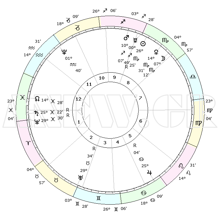 | | ΘΕΣΕΙΣ ΠΛΑΝΗΤΩΝ ΑΣΤΡΟΛΟΓΙΚΟΥ ΧΑΡΤΗ ΤΗΣ ΣΤΙΓΜΗΣ ΑΥΤΗΣ | | | | Πλανήτης | Ζώδιο | Μοίρες | Δεκαήμ. | Σε οίκο | Απόκλιση | | Ακμές των οίκων | | Ηλιος | Σκορπιός | 26°20' | Τρίτο | 9 | 19 S 20 | | 1ος | 14°55' | Υδροχόος | | Σελήνη | Σκορπιός | 06°22' | Πρώτο | 9 | 17 S 18 | | 2ος | 00°37' | Κριός | | Ερμής | Τοξότης | 00°55'R | Πρώτο | 9 | 20 S 27 | | 3ος | 06°21' | Ταύρος | | Αφροδίτη | Σκορπιός | 14°26' | Δεύτερο | 9 | 15 S 06 | | 4ος | 02°30' | Δίδυμοι | | Αρης | Τοξότης | 10°04' | Δεύτερο | 10 | 22 S 30 | | 5ος | 24°28' | Δίδυμοι | | Δίας | Καρκίνος | 25°05'R | Τρίτο | 6 | 21 N 14 | | 6ος | 16°42' | Καρκίνος | | Κρόνος | Ιχθείς | 25°22'R | Τρίτο | 1 | 04 S 03 | | 7ος | 14°55' | Λέων | | Ουρανός | Ταύρος | 29°34'R | Τρίτο | 3 | 19 N 51 | | 8ος | 00°37' | Ζυγός | | Ποσειδώνας | Ιχθείς | 29°30'R | Τρίτο | 1 | 01 S 27 | | 9ος | 06°21' | Σκορπιός | | Πλούτωνας | Υδροχόος | 01°40' | Πρώτο | 12 | 23 S 27 | | 10ος | 02°30' | Τοξότης | | Β. Δεσμός | Ιχθείς | 14°29' | Δεύτερο | 1 | 06 S 07 | | 11ος | 24°28' | Τοξότης | | Ωροσκόπος | Υδροχόος | 14°55' | Δεύτερο | | | 12ος | 16°42' | Αιγόκερως | | Μεσουράνημα | Τοξότης | 02°30' | Πρώτο | | | |