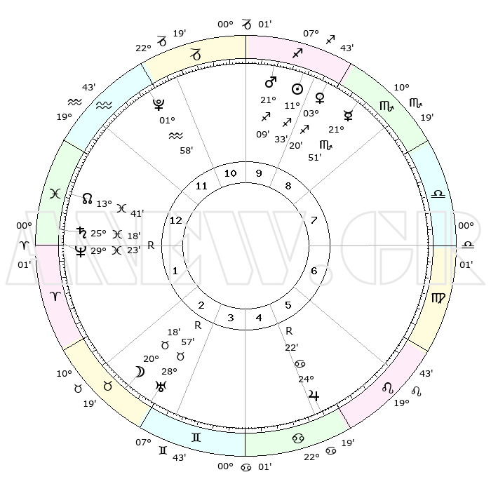 | | ΘΕΣΕΙΣ ΠΛΑΝΗΤΩΝ ΑΣΤΡΟΛΟΓΙΚΟΥ ΧΑΡΤΗ ΤΗΣ ΣΤΙΓΜΗΣ ΑΥΤΗΣ | | | | Πλανήτης | Ζώδιο | Μοίρες | Δεκαήμ. | Σε οίκο | Απόκλιση | | Ακμές των οίκων | | Ηλιος | Τοξότης | 11°32' | Δεύτερο | 9 | 22 S 10 | | 1ος | 14°58' | Ιχθείς | | Σελήνη | Ταύρος | 19°55' | Δεύτερο | 2 | 22 N 07 | | 2ος | 28°27' | Κριός | | Ερμής | Σκορπιός | 21°50' | Τρίτο | 8 | 15 S 42 | | 3ος | 28°20' | Ταύρος | | Αφροδίτη | Τοξότης | 03°18' | Πρώτο | 9 | 20 S 12 | | 4ος | 21°29' | Δίδυμοι | | Αρης | Τοξότης | 21°08' | Τρίτο | 9 | 23 S 49 | | 5ος | 13°18' | Καρκίνος | | Δίας | Καρκίνος | 24°22'R | Τρίτο | 5 | 21 N 24 | | 6ος | 08°36' | Λέων | | Κρόνος | Ιχθείς | 25°18' | Τρίτο | 1 | 04 S 02 | | 7ος | 14°58' | Παρθένος | | Ουρανός | Ταύρος | 28°57'R | Τρίτο | 3 | 19 N 43 | | 8ος | 28°27' | Ζυγός | | Ποσειδώνας | Ιχθείς | 29°23'R | Τρίτο | 1 | 01 S 29 | | 9ος | 28°20' | Σκορπιός | | Πλούτωνας | Υδροχόος | 01°58' | Πρώτο | 11 | 23 S 23 | | 10ος | 21°29' | Τοξότης | | Β. Δεσμός | Ιχθείς | 13°41' | Δεύτερο | 12 | 06 S 25 | | 11ος | 13°18' | Αιγόκερως | | Ωροσκόπος | Ιχθείς | 14°58' | Δεύτερο | | | 12ος | 08°36' | Υδροχόος | | Μεσουράνημα | Τοξότης | 21°29' | Τρίτο | | | |