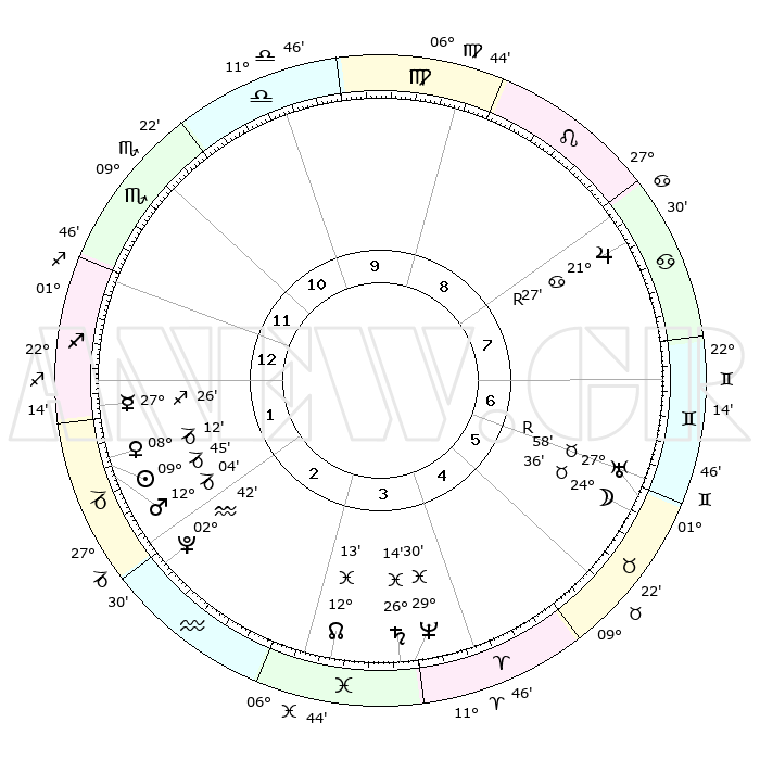 | | ΘΕΣΕΙΣ ΠΛΑΝΗΤΩΝ ΑΣΤΡΟΛΟΓΙΚΟΥ ΧΑΡΤΗ ΤΗΣ ΣΤΙΓΜΗΣ ΑΥΤΗΣ | | | | Πλανήτης | Ζώδιο | Μοίρες | Δεκαήμ. | Σε οίκο | Απόκλιση | | Ακμές των οίκων | | Ηλιος | Αιγόκερως | 09°13' | Πρώτο | 6 | 23 S 07 | | 1ος | 21°51' | Καρκίνος | | Σελήνη | Ταύρος | 17°03' | Δεύτερο | 11 | 21 N 21 | | 2ος | 12°28' | Λέων | | Ερμής | Τοξότης | 26°39' | Τρίτο | 6 | 23 S 49 | | 3ος | 06°26' | Παρθένος | | Αφροδίτη | Αιγόκερως | 07°33' | Πρώτο | 6 | 23 S 40 | | 4ος | 06°20' | Ζυγός | | Αρης | Αιγόκερως | 11°41' | Δεύτερο | 6 | 23 S 48 | | 5ος | 12°23' | Σκορπιός | | Δίας | Καρκίνος | 21°32'R | Τρίτο | 12 | 21 N 57 | | 6ος | 19°28' | Τοξότης | | Κρόνος | Ιχθείς | 26°13' | Τρίτο | 9 | 03 S 35 | | 7ος | 21°51' | Αιγόκερως | | Ουρανός | Ταύρος | 27°59'R | Τρίτο | 11 | 19 N 31 | | 8ος | 12°28' | Υδροχόος | | Ποσειδώνας | Ιχθείς | 29°30' | Τρίτο | 9 | 01 S 26 | | 9ος | 06°26' | Ιχθείς | | Πλούτωνας | Υδροχόος | 02°41' | Πρώτο | 7 | 23 S 14 | | 10ος | 06°20' | Κριός | | Β. Δεσμός | Ιχθείς | 12°14' | Δεύτερο | 9 | 06 S 58 | | 11ος | 12°23' | Ταύρος | | Ωροσκόπος | Καρκίνος | 21°51' | Τρίτο | | | 12ος | 19°28' | Δίδυμοι | | Μεσουράνημα | Κριός | 06°20' | Πρώτο | | | |