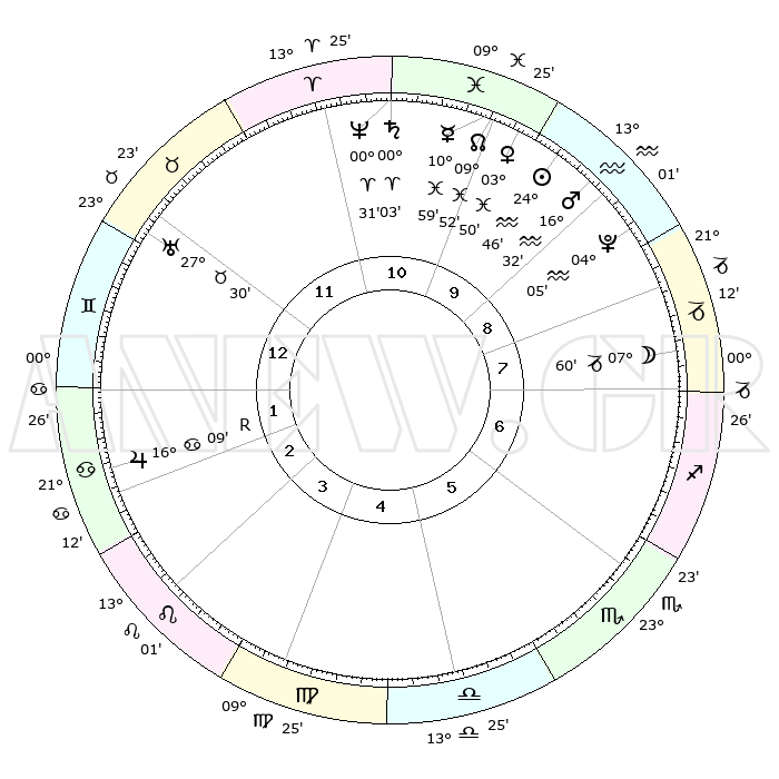 | | ΘΕΣΕΙΣ ΠΛΑΝΗΤΩΝ ΑΣΤΡΟΛΟΓΙΚΟΥ ΧΑΡΤΗ ΤΗΣ ΣΤΙΓΜΗΣ ΑΥΤΗΣ | | | | Πλανήτης | Ζώδιο | Μοίρες | Δεκαήμ. | Σε οίκο | Απόκλιση | | Ακμές των οίκων | | Ηλιος | Υδροχόος | 24°42' | Τρίτο | 10 | 13 S 17 | | 1ος | 04°36' | Δίδυμοι | | Σελήνη | Αιγόκερως | 07°08' | Πρώτο | 8 | 27 S 53 | | 2ος | 28°32' | Δίδυμοι | | Ερμής | Ιχθείς | 10°53' | Δεύτερο | 10 | 07 S 45 | | 3ος | 19°49' | Καρκίνος | | Αφροδίτη | Ιχθείς | 03°45' | Πρώτο | 10 | 11 S 30 | | 4ος | 12°57' | Λέων | | Αρης | Υδροχόος | 16°29' | Δεύτερο | 10 | 16 S 55 | | 5ος | 12°14' | Παρθένος | | Δίας | Καρκίνος | 16°09'R | Δεύτερο | 2 | 22 N 47 | | 6ος | 21°20' | Ζυγός | | Κρόνος | Κριός | 00°03' | Πρώτο | 11 | 01 S 57 | | 7ος | 04°36' | Τοξότης | | Ουρανός | Ταύρος | 27°30' | Τρίτο | 12 | 19 N 25 | | 8ος | 28°32' | Τοξότης | | Ποσειδώνας | Κριός | 00°31' | Πρώτο | 11 | 01 S 00 | | 9ος | 19°49' | Αιγόκερως | | Πλούτωνας | Υδροχόος | 04°05' | Πρώτο | 9 | 22 S 57 | | 10ος | 12°57' | Υδροχόος | | Β. Δεσμός | Ιχθείς | 09°52' | Πρώτο | 10 | 07 S 52 | | 11ος | 12°14' | Ιχθείς | | Ωροσκόπος | Δίδυμοι | 04°36' | Πρώτο | | | 12ος | 21°20' | Κριός | | Μεσουράνημα | Υδροχόος | 12°57' | Δεύτερο | | | |