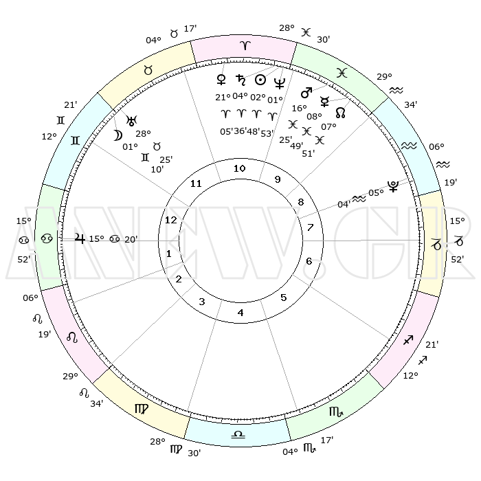 | | ΘΕΣΕΙΣ ΠΛΑΝΗΤΩΝ ΑΣΤΡΟΛΟΓΙΚΟΥ ΧΑΡΤΗ ΤΗΣ ΣΤΙΓΜΗΣ ΑΥΤΗΣ | | | | Πλανήτης | Ζώδιο | Μοίρες | Δεκαήμ. | Σε οίκο | Απόκλιση | | Ακμές των οίκων | | Ηλιος | Κριός | 02°44' | Πρώτο | 10 | 01 N 05 | | 1ος | 23°28' | Δίδυμοι | | Σελήνη | Δίδυμοι | 00°10' | Πρώτο | 12 | 25 N 14 | | 2ος | 14°46' | Καρκίνος | | Ερμής | Ιχθείς | 08°48' | Πρώτο | 10 | 07 S 55 | | 3ος | 06°13' | Λέων | | Αφροδίτη | Κριός | 20°59' | Τρίτο | 11 | 07 N 28 | | 4ος | 01°33' | Παρθένος | | Αρης | Ιχθείς | 16°21' | Δεύτερο | 10 | 06 S 22 | | 5ος | 04°22' | Ζυγός | | Δίας | Καρκίνος | 15°20' | Δεύτερο | 2 | 22 N 55 | | 6ος | 14°39' | Σκορπιός | | Κρόνος | Κριός | 04°35' | Πρώτο | 11 | 00 S 08 | | 7ος | 23°28' | Τοξότης | | Ουρανός | Ταύρος | 28°25' | Τρίτο | 12 | 19 N 38 | | 8ος | 14°46' | Αιγόκερως | | Ποσειδώνας | Κριός | 01°53' | Πρώτο | 10 | 00 S 27 | | 9ος | 06°13' | Υδροχόος | | Πλούτωνας | Υδροχόος | 05°04' | Πρώτο | 8 | 22 S 48 | | 10ος | 01°33' | Ιχθείς | | Β. Δεσμός | Ιχθείς | 07°52' | Πρώτο | 10 | 08 S 37 | | 11ος | 04°22' | Κριός | | Ωροσκόπος | Δίδυμοι | 23°28' | Τρίτο | | | 12ος | 14°39' | Ταύρος | | Μεσουράνημα | Ιχθείς | 01°33' | Πρώτο | | | |