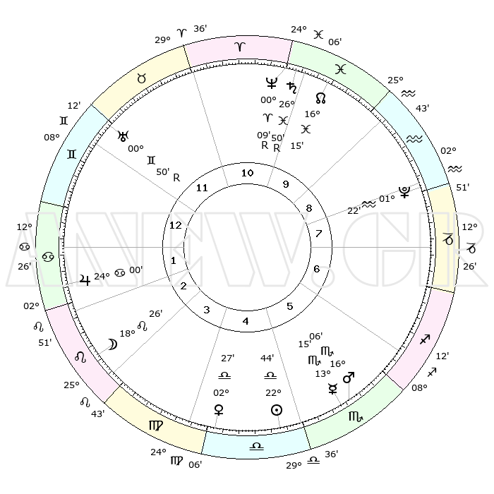 | ΘΕΣΕΙΣ ΠΛΑΝΗΤΩΝ ΑΣΤΡΟΛΟΓΙΚΟΥ ΧΑΡΤΗ ΤΗΣ ΣΤΙΓΜΗΣ ΑΥΤΗΣ | | Πλανήτης | Ζώδιο | Μοίρες | Δεκαήμ. | Σε οίκο | Απόκλιση | | Ακμές των οίκων | Ηλιος | Ζυγός | 22°37' | Τρίτο | 6 | 08 S 48 | | 1ος | 02°06' | Δίδυμοι | Σελήνη | Λέων | 16°57' | Δεύτερο | 4 | 18 N 19 | | 2ος | 26°30' | Δίδυμοι | Ερμής | Σκορπιός | 13°05' | Δεύτερο | 6 | 17 S 29 | | 3ος | 17°51' | Καρκίνος | Αφροδίτη | Ζυγός | 02°18' | Πρώτο | 5 | 00 N 29 | | 4ος | 10°46' | Λέων | Αρης | Σκορπιός | 16°01' | Δεύτερο | 6 | 16 S 51 | | 5ος | 09°36' | Παρθένος | Δίας | Καρκίνος | 23°59' | Τρίτο | 3 | 21 N 21 | | 6ος | 18°21' | Ζυγός | Κρόνος | Ιχθείς | 26°50'R | Τρίτο | 11 | 03 S 33 | | 7ος | 02°06' | Τοξότης | Ουρανός | Δίδυμοι | 00°50'R | Πρώτο | 12 | 20 N 07 | | 8ος | 26°30' | Τοξότης | Ποσειδώνας | Κριός | 00°09'R | Πρώτο | 11 | 01 S 12 | | 9ος | 17°51' | Αιγόκερως | Πλούτωνας | Υδροχόος | 01°22' | Πρώτο | 9 | 23 S 32 | | 10ος | 10°46' | Υδροχόος | Β. Δεσμός | Ιχθείς | 16°16' | Δεύτερο | 11 | 05 S 25 | | 11ος | 09°36' | Ιχθείς | Ωροσκόπος | Δίδυμοι | 02°06' | Πρώτο | | | 12ος | 18°21' | Κριός | Μεσουράνημα | Υδροχόος | 10°46' | Δεύτερο | | | |