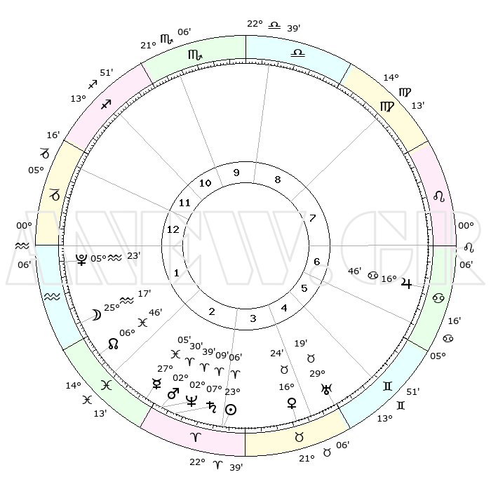 | | ΘΕΣΕΙΣ ΠΛΑΝΗΤΩΝ ΑΣΤΡΟΛΟΓΙΚΟΥ ΧΑΡΤΗ ΤΗΣ ΣΤΙΓΜΗΣ ΑΥΤΗΣ | | | | Πλανήτης | Ζώδιο | Μοίρες | Δεκαήμ. | Σε οίκο | Απόκλιση | | Ακμές των οίκων | | Ηλιος | Κριός | 23°02' | Τρίτο | 3 | 08 N 57 | | 1ος | 02°11' | Αιγόκερως | | Σελήνη | Υδροχόος | 24°19' | Τρίτο | 2 | 14 S 35 | | 2ος | 09°53' | Υδροχόος | | Ερμής | Ιχθείς | 26°59' | Τρίτο | 3 | 03 S 30 | | 3ος | 20°01' | Ιχθείς | | Αφροδίτη | Ταύρος | 16°18' | Δεύτερο | 4 | 16 N 47 | | 4ος | 23°36' | Κριός | | Αρης | Κριός | 02°26' | Πρώτο | 3 | 00 N 03 | | 5ος | 19°35' | Ταύρος | | Δίας | Καρκίνος | 16°45' | Δεύτερο | 7 | 22 N 45 | | 6ος | 11°15' | Δίδυμοι | | Κρόνος | Κριός | 07°08' | Πρώτο | 3 | 00 N 52 | | 7ος | 02°11' | Καρκίνος | | Ουρανός | Ταύρος | 29°19' | Τρίτο | 5 | 19 N 50 | | 8ος | 09°53' | Λέων | | Ποσειδώνας | Κριός | 02°39' | Πρώτο | 3 | 00 S 09 | | 9ος | 20°01' | Παρθένος | | Πλούτωνας | Υδροχόος | 05°23' | Πρώτο | 1 | 22 S 47 | | 10ος | 23°36' | Ζυγός | | Β. Δεσμός | Ιχθείς | 06°46' | Πρώτο | 2 | 09 S 01 | | 11ος | 19°35' | Σκορπιός | | Ωροσκόπος | Αιγόκερως | 02°11' | Πρώτο | | | 12ος | 11°15' | Τοξότης | | Μεσουράνημα | Ζυγός | 23°36' | Τρίτο | | | |