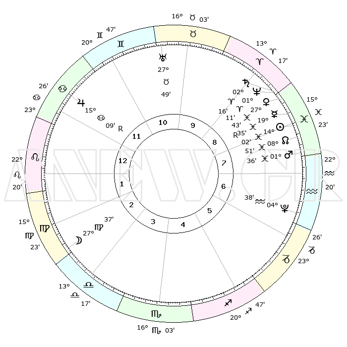 | | ΘΕΣΕΙΣ ΠΛΑΝΗΤΩΝ ΑΣΤΡΟΛΟΓΙΚΟΥ ΧΑΡΤΗ ΤΗΣ ΣΤΙΓΜΗΣ ΑΥΤΗΣ | | | | Πλανήτης | Ζώδιο | Μοίρες | Δεκαήμ. | Σε οίκο | Απόκλιση | | Ακμές των οίκων | | Ηλιος | Ιχθείς | 13°58' | Δεύτερο | 8 | 06 S 18 | | 1ος | 05°51' | Λέων | | Σελήνη | Παρθένος | 26°52' | Τρίτο | 3 | 00 S 15 | | 2ος | 27°19' | Λέων | | Ερμής | Ιχθείς | 19°38'R | Δεύτερο | 8 | 00 S 44 | | 3ος | 23°10' | Παρθένος | | Αφροδίτη | Ιχθείς | 27°39' | Τρίτο | 9 | 02 S 08 | | 4ος | 24°51' | Ζυγός | | Αρης | Ιχθείς | 01°33' | Πρώτο | 8 | 11 S 57 | | 5ος | 00°41' | Τοξότης | | Δίας | Καρκίνος | 15°09'R | Δεύτερο | 12 | 22 N 55 | | 6ος | 05°27' | Αιγόκερως | | Κρόνος | Κριός | 02°16' | Πρώτο | 9 | 01 S 03 | | 7ος | 05°51' | Υδροχόος | | Ουρανός | Ταύρος | 27°49' | Τρίτο | 10 | 19 N 30 | | 8ος | 27°19' | Υδροχόος | | Ποσειδώνας | Κριός | 01°11' | Πρώτο | 9 | 00 S 44 | | 9ος | 23°10' | Ιχθείς | | Πλούτωνας | Υδροχόος | 04°38' | Πρώτο | 6 | 22 S 52 | | 10ος | 24°51' | Κριός | | Β. Δεσμός | Ιχθείς | 08°51' | Πρώτο | 8 | 08 S 15 | | 11ος | 00°41' | Δίδυμοι | | Ωροσκόπος | Λέων | 05°51' | Πρώτο | | | 12ος | 05°27' | Καρκίνος | | Μεσουράνημα | Κριός | 24°51' | Τρίτο | | | |