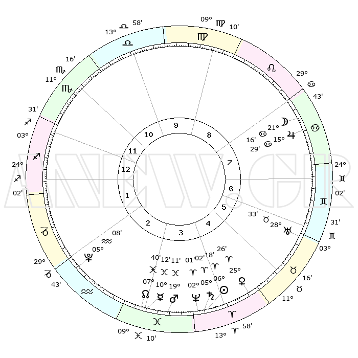 | | ΘΕΣΕΙΣ ΠΛΑΝΗΤΩΝ ΑΣΤΡΟΛΟΓΙΚΟΥ ΧΑΡΤΗ ΤΗΣ ΣΤΙΓΜΗΣ ΑΥΤΗΣ | | | | Πλανήτης | Ζώδιο | Μοίρες | Δεκαήμ. | Σε οίκο | Απόκλιση | | Ακμές των οίκων | | Ηλιος | Κριός | 06°14' | Πρώτο | 4 | 02 N 28 | | 1ος | 04°08' | Τοξότης | | Σελήνη | Καρκίνος | 20°22' | Τρίτο | 8 | 25 N 45 | | 2ος | 05°52' | Αιγόκερως | | Ερμής | Ιχθείς | 10°10' | Δεύτερο | 3 | 08 S 07 | | 3ος | 12°16' | Υδροχόος | | Αφροδίτη | Κριός | 25°21' | Τρίτο | 5 | 09 N 12 | | 4ος | 18°22' | Ιχθείς | | Αρης | Ιχθείς | 19°08' | Δεύτερο | 4 | 05 S 17 | | 5ος | 18°51' | Κριός | | Δίας | Καρκίνος | 15°29' | Δεύτερο | 8 | 22 N 54 | | 6ος | 13°20' | Ταύρος | | Κρόνος | Κριός | 05°02' | Πρώτο | 4 | 00 N 03 | | 7ος | 04°08' | Δίδυμοι | | Ουρανός | Ταύρος | 28°33' | Τρίτο | 6 | 19 N 40 | | 8ος | 05°52' | Καρκίνος | | Ποσειδώνας | Κριός | 02°01' | Πρώτο | 4 | 00 S 24 | | 9ος | 12°16' | Λέων | | Πλούτωνας | Υδροχόος | 05°08' | Πρώτο | 2 | 22 S 48 | | 10ος | 18°22' | Παρθένος | | Β. Δεσμός | Ιχθείς | 07°40' | Πρώτο | 3 | 08 S 41 | | 11ος | 18°51' | Ζυγός | | Ωροσκόπος | Τοξότης | 04°08' | Πρώτο | | | 12ος | 13°20' | Σκορπιός | | Μεσουράνημα | Παρθένος | 18°22' | Δεύτερο | | | |